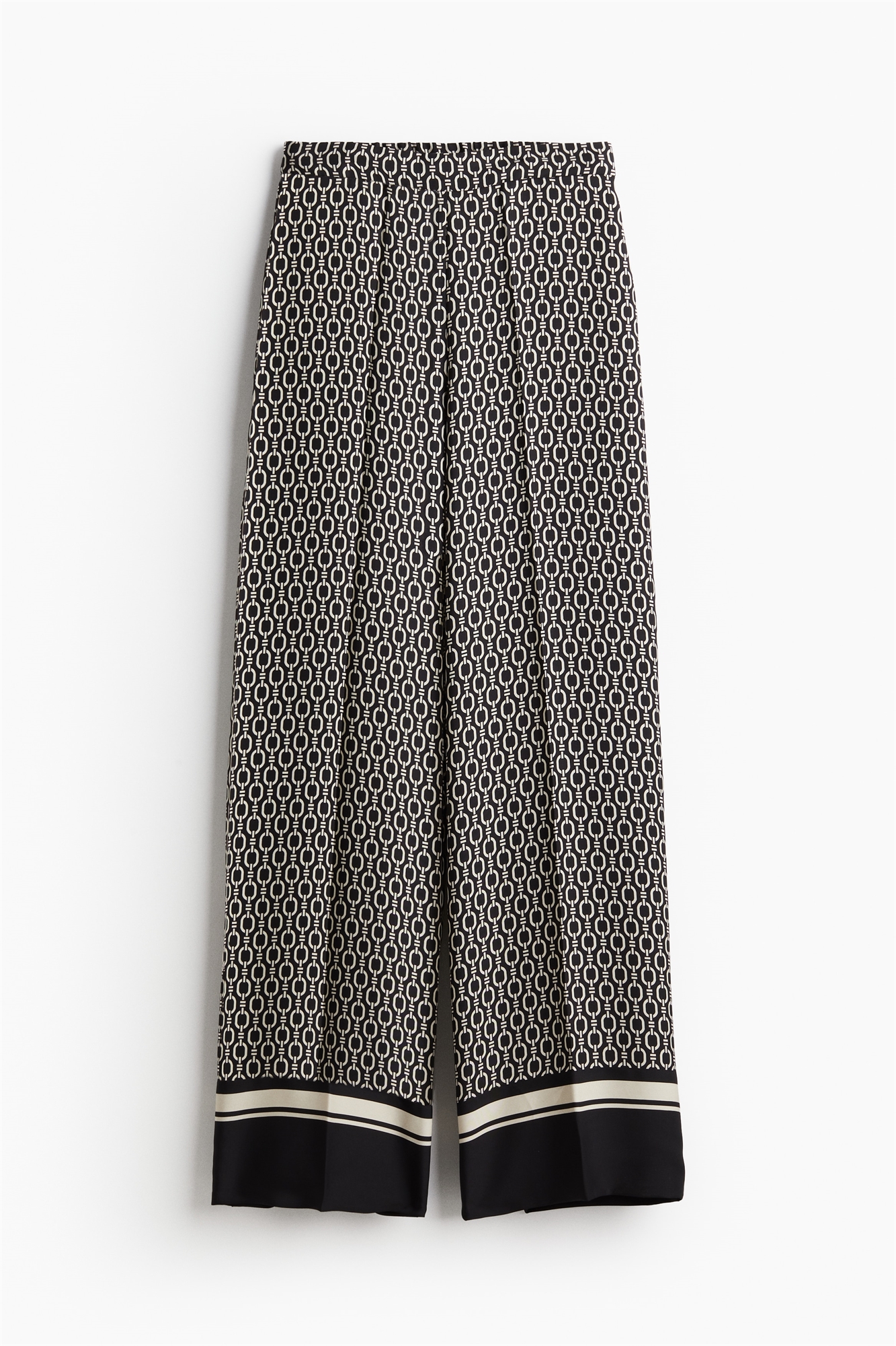Брюки из тканого материала с высокой талией, эластичной резинкой сзади и потайной застежкой на молнию, пуговицу и крючок с ушком с одной стороны. Неприметные карманы в боковых швах и широкие ноги со складками спереди и сзади.