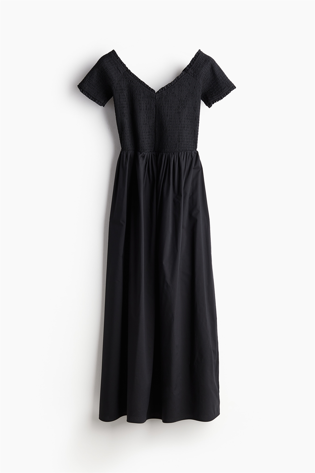 Платье длиной до колена из тканого материала с V-образным вырезом без плеч, приталенным лифом и короткими рукавами с плавками. Сборки на талии и расклешенная юбка. Без подкладки.