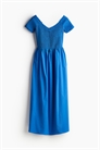 Платье длиной до колена из тканого материала с V-образным вырезом без плеч, приталенным лифом и короткими рукавами с плавками. Сборки на талии и расклешенная юбка. Без подкладки.