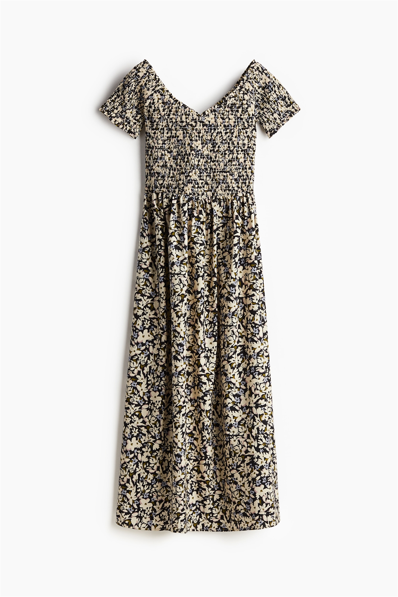 Платье длиной до колена из тканого материала с V-образным вырезом без плеч, приталенным лифом и короткими рукавами с плавками. Сборки на талии и расклешенная юбка. Без подкладки.