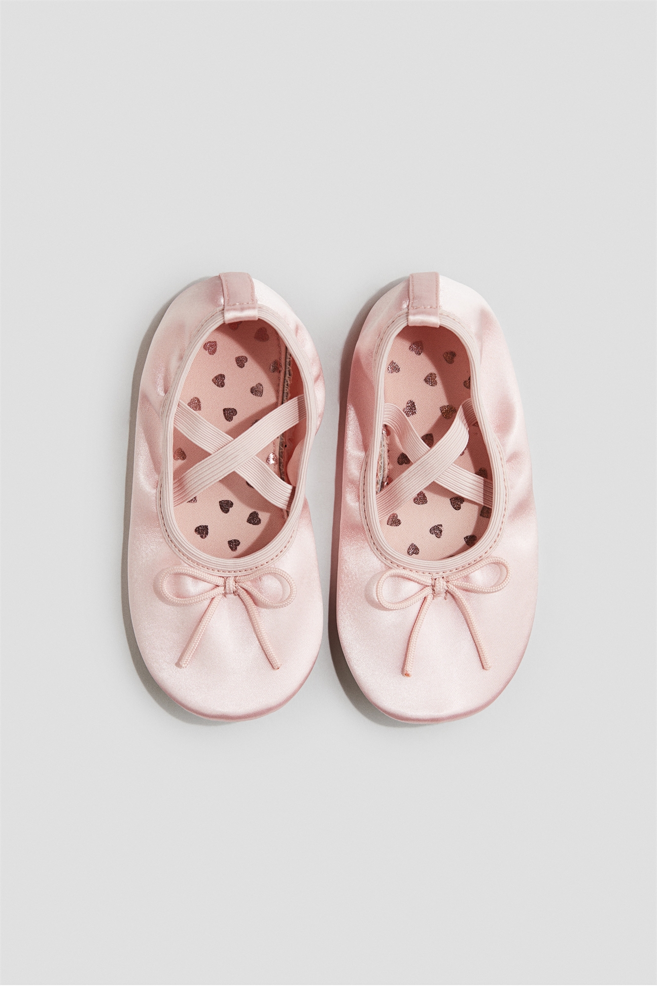 Балетные туфли из мерцающего атласа с декоративным бантом спереди, эластичными ремешками, перекрещивающимися на ноге, и скрытой эластичной резинкой вокруг отверстия. Подкладка из джерси и стелька из набивного джерси. Только для использования в помещении.