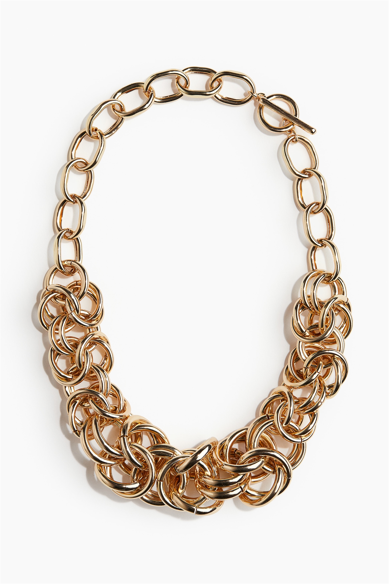 Ожерелье из толстых металлических звеньев с переплетенными кольцами спереди и застежкой-тоглом сзади.