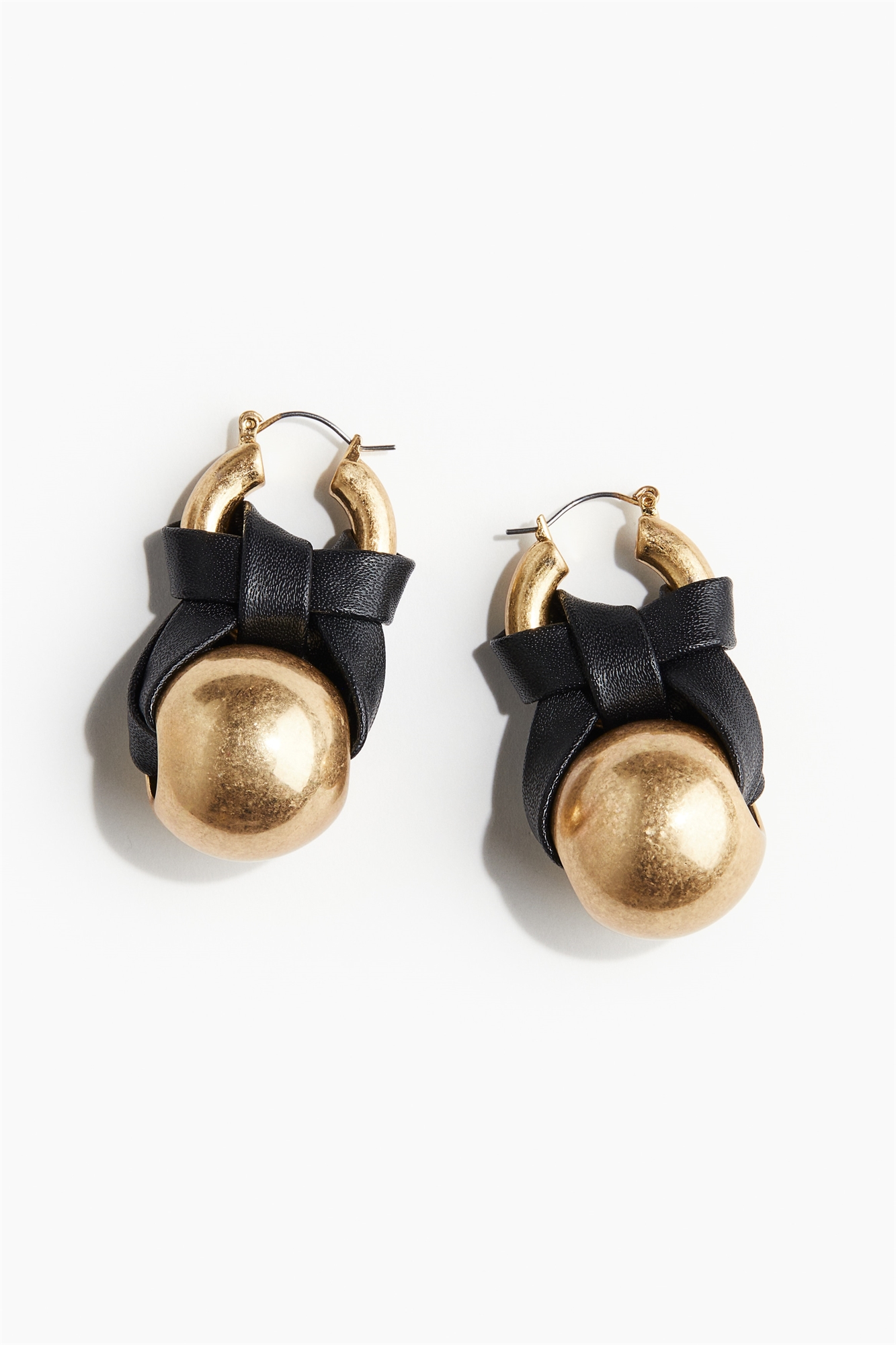 Серьги-обручи с подвеской из бусин, которая крепится с помощью ремешка из ткани с покрытием.