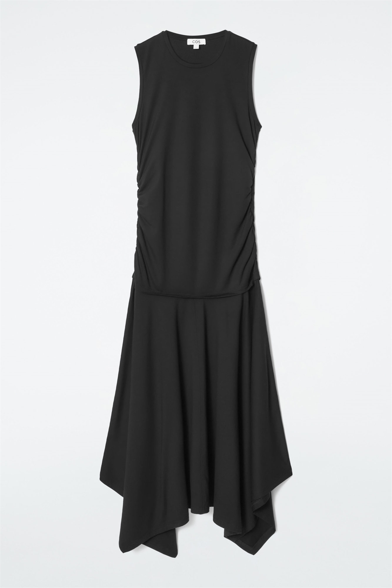 Это черное платье-миди отличается нежными складками с обеих сторон. Изготовленное из мягкого хлопкового джерси-стрейч, оно также имеет круглый вырез и заостренный подол. Сочетайте его с аксессуарами подходящего цвета. Облегающий крой Внешняя ткань: 91% хлопок, 9% эластан. Детали исключены/Машинная стирка Длина по спинке в размере S = 136,5 см/Модель носит размер S