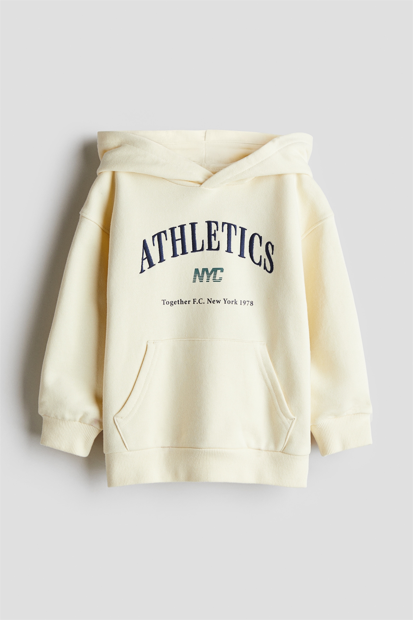 Толстовка с принтом из легкой хлопковой ткани. Капюшон на подкладке, спущенные плечи и длинные рукава. Карман-кенгуру, манжеты и подол в рубчик.