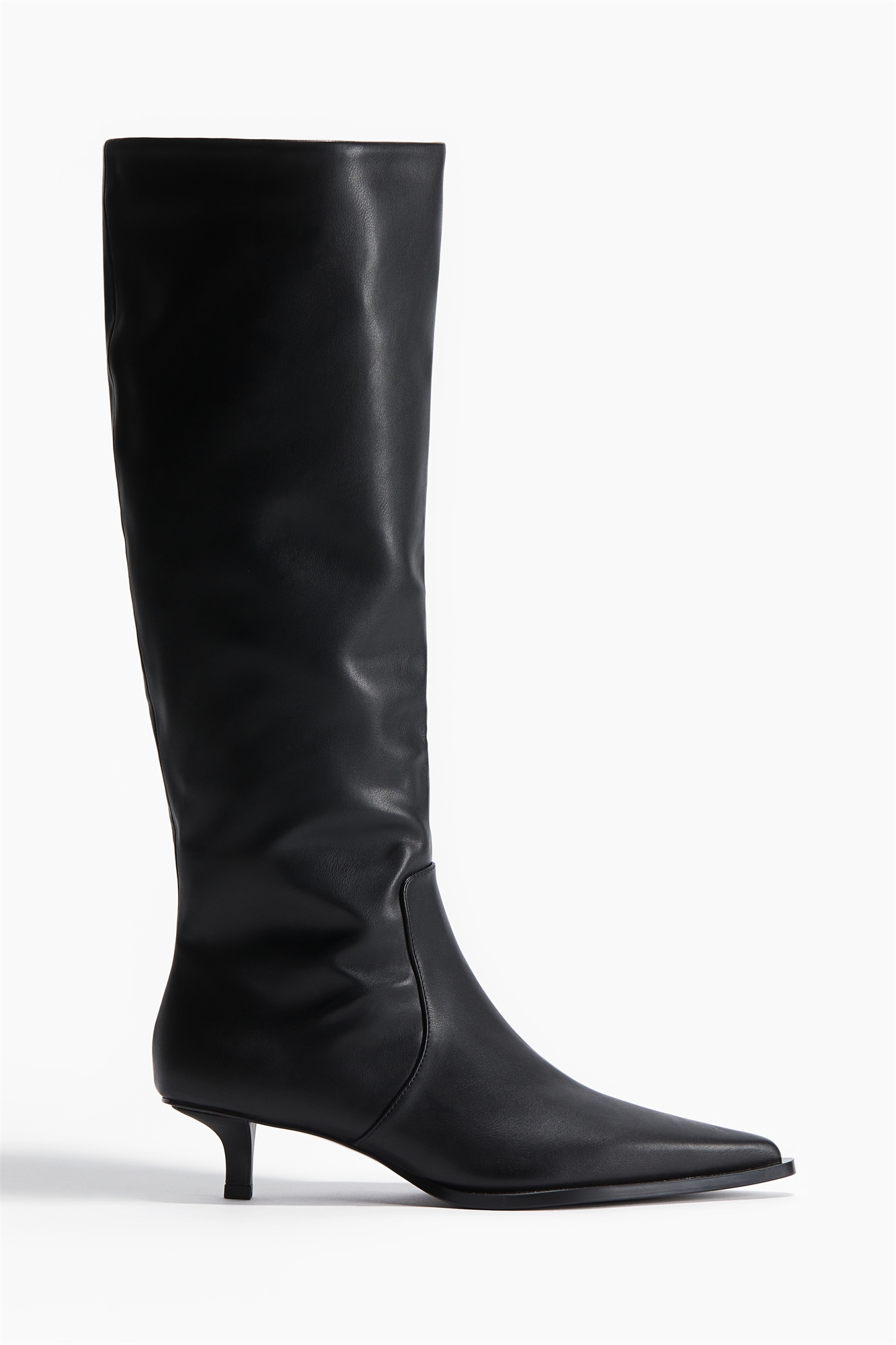 Сапоги из ткани с покрытием, с заостренным носком, каблуком и голенищем до колена. Подкладка и стелька из джерси.
