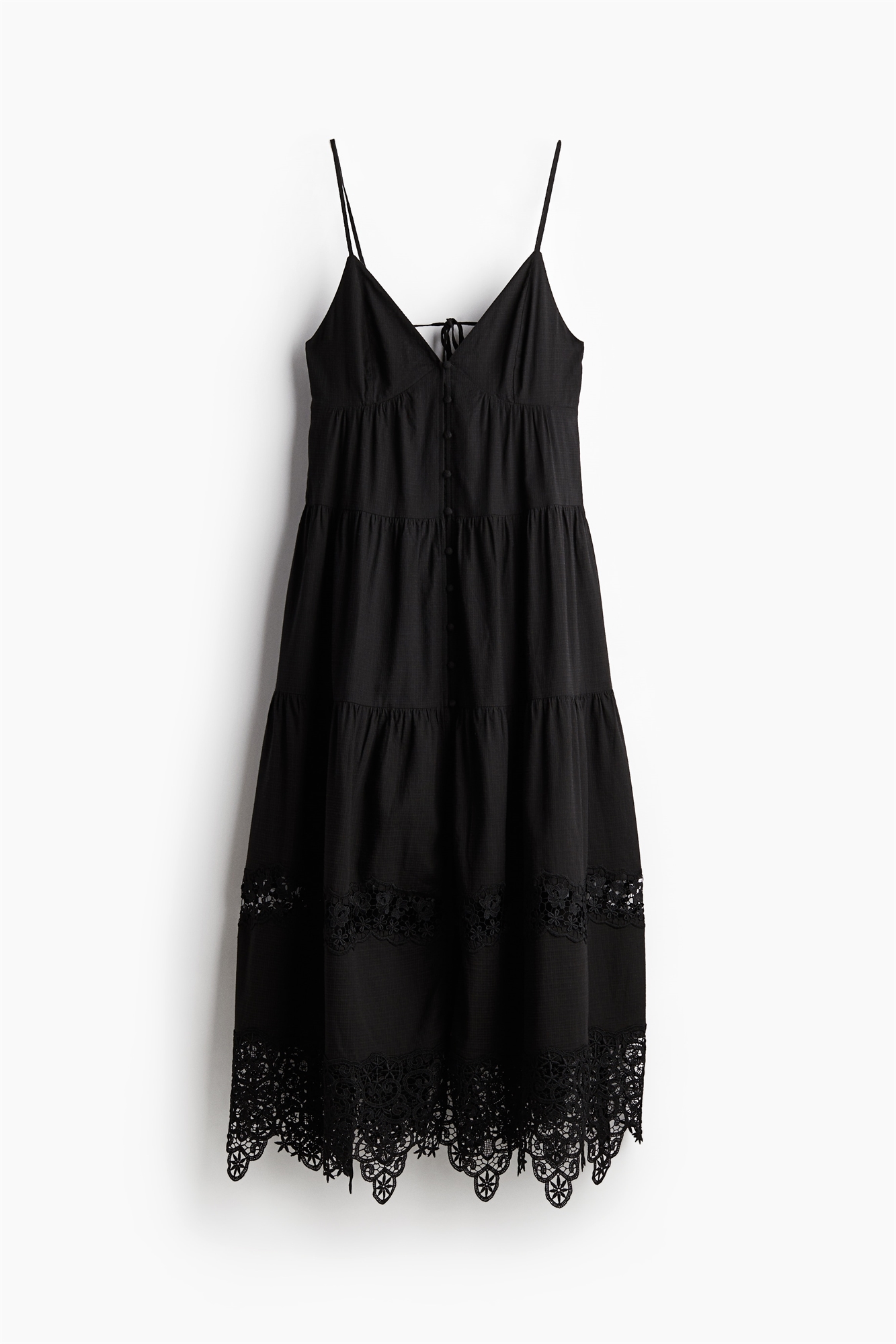 Платье длиной до щиколоток из хлопка и вискозы с нежными кружевными вставками. V-образный вырез, застежка на пуговицы спереди и открытый разрез с эластичной отделкой сзади. Регулируемые бретели-спагетти, которые продеваются через маленькие петельки и завязываются сзади. Юбка с ярусами и гребешковым подолом. Частично на подкладке.