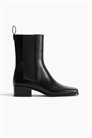 Ботинки челси из ткани с покрытием, квадратным носком, каблуком и голенищем с эластичными прорезями по бокам и петлей с металлической деталью сзади. Атласные подкладка и стелька.