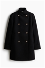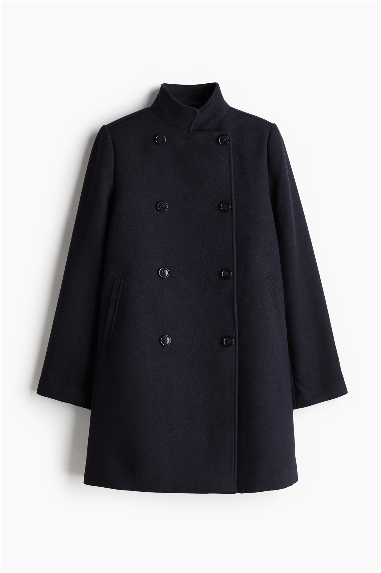 Двубортное пальто длиной до колена из тканого материала с воротником-стойкой, застежкой на пуговицы спереди и втачными боковыми карманами. На подкладке.