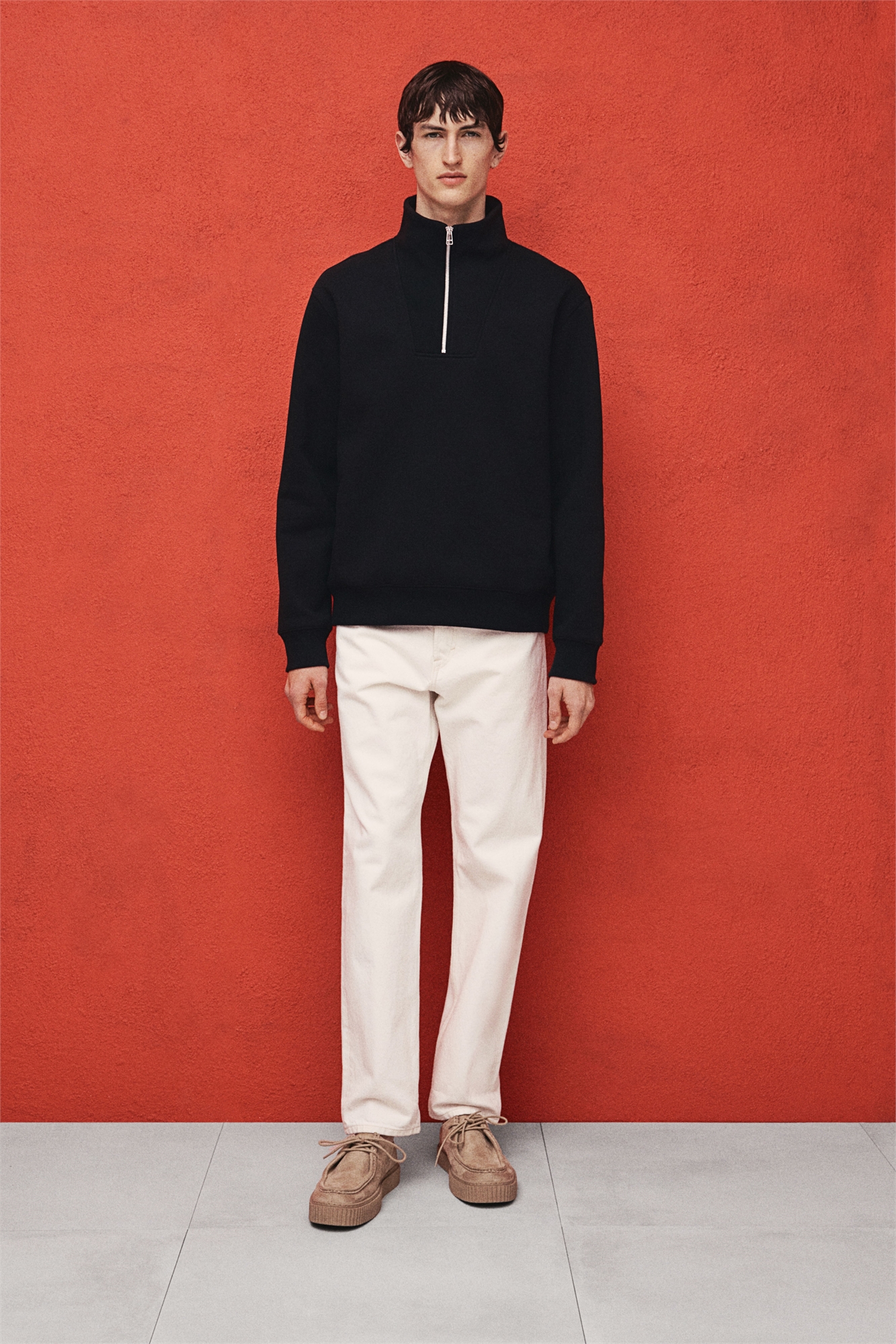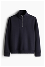 Топ из плотной толстовочной ткани с мягким начесом внутри. Воротник-стойка, застежка на молнии, спущенные плечи и длинные рукава. Ребристые манжеты и подол. Регулярный крой для комфортной носки и классического силуэта.