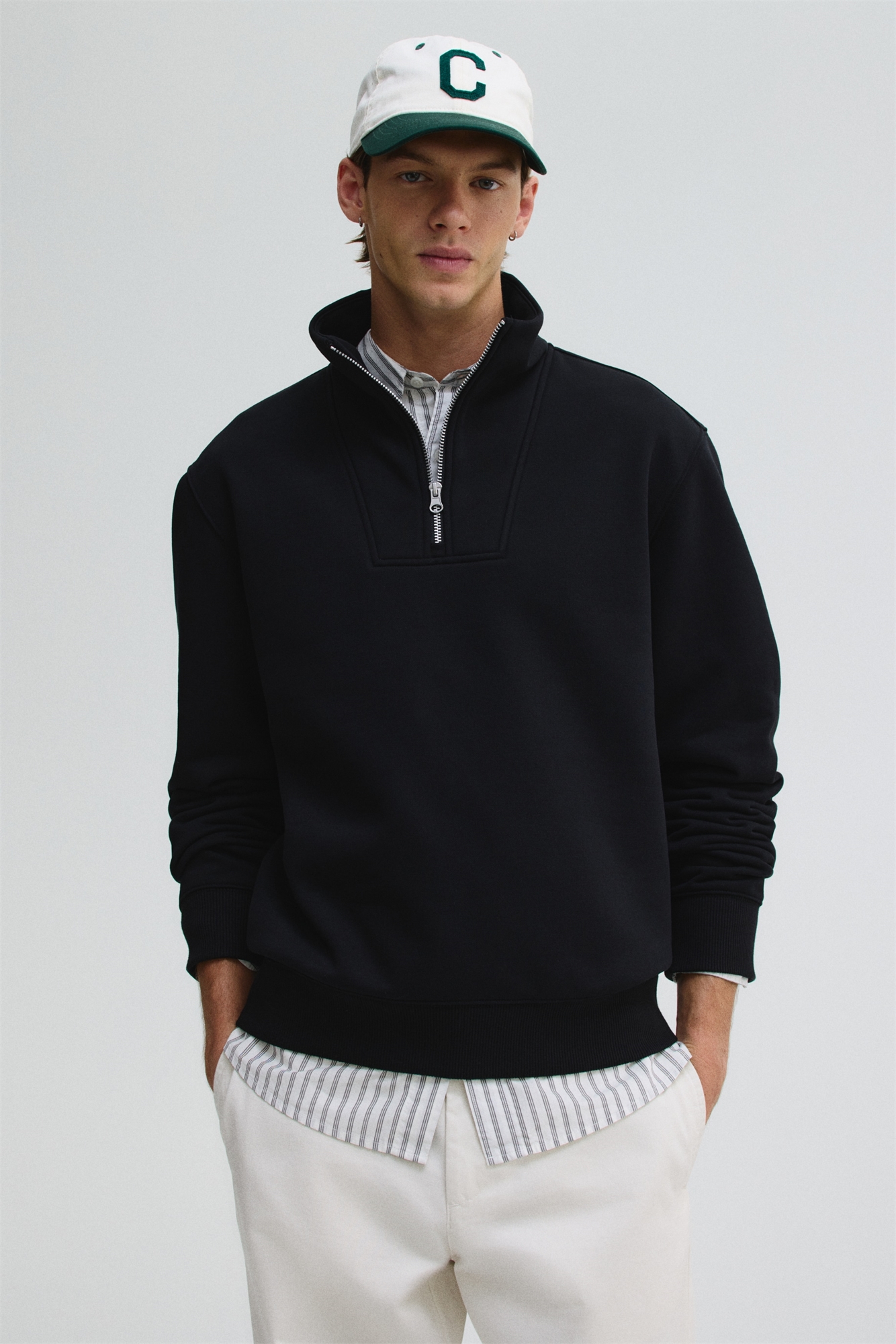 Топ из плотной толстовочной ткани с мягким начесом внутри. Воротник-стойка, застежка на молнии, спущенные плечи и длинные рукава. Ребристые манжеты и подол. Регулярный крой для комфортной носки и классического силуэта.