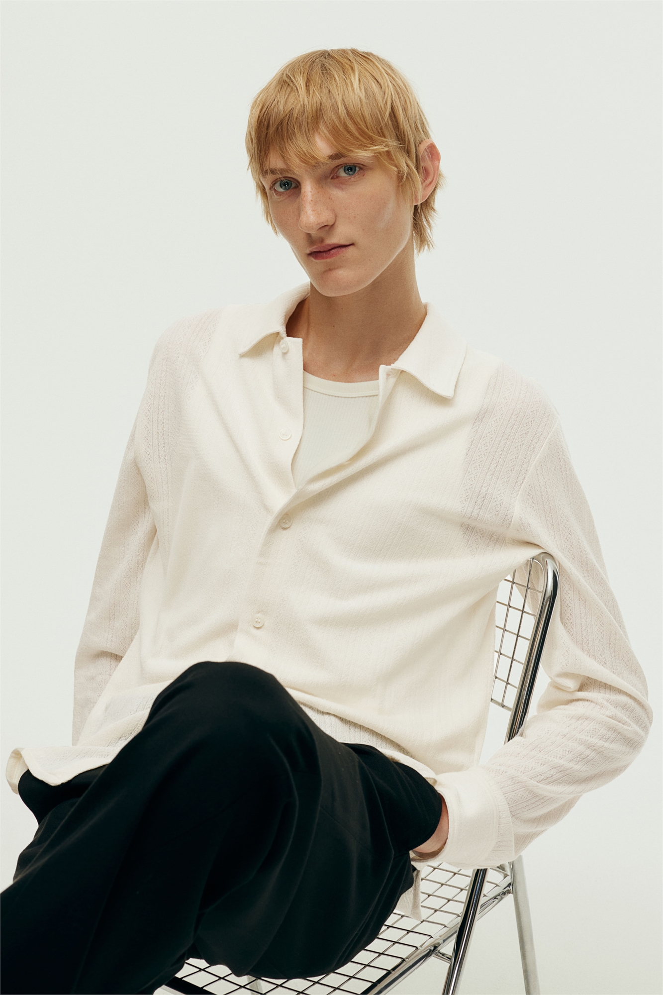 Рубашка из легкого кружевного трикотажа с отложным воротником и французским передом. Длинные рукава с манжетами на пуговицах и рукавной планкой с пуговицей. Регулярный крой для комфортной носки и классического силуэта.