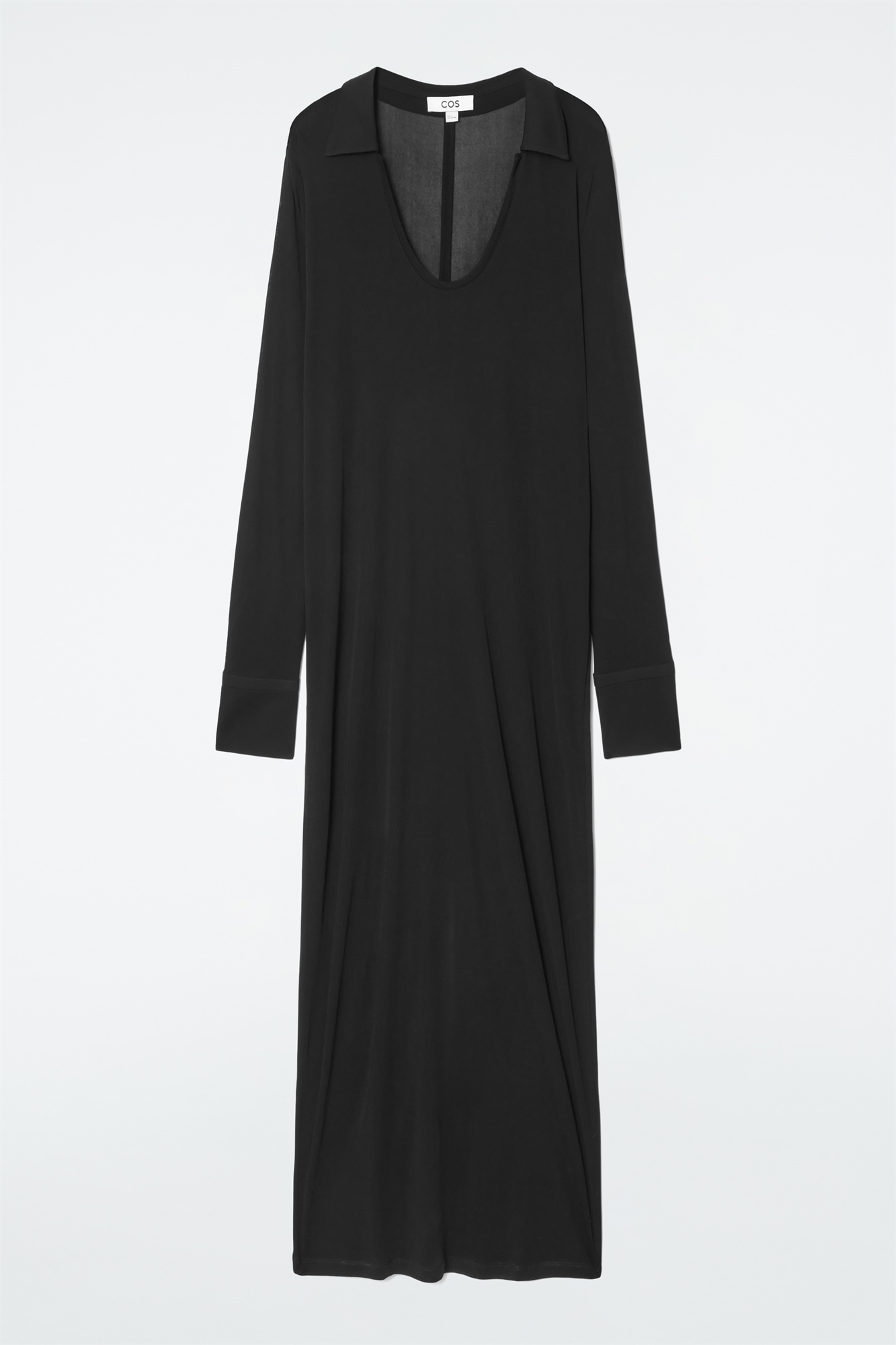 Это черное платье-макси, созданное по мотивам классической рубашки-поло, имеет вырез U-образной формы и отложной воротник. Трикотажная ткань NAIA™ Renew имеет мягкий блеск, а высокий разрез сзади создает ощущение движения. Зауженный крой Раздельные манжеты на пуговицах NAIA™ Renew изготовлен из экологически чистой древесной массы и переработанных отходов Оболочка: 75% ацетат целлюлозы NAIA™ Renew, 25% полиамид. Без учета отделки / Машинная стирка Длина по спинке для размера S составляет 131,5 см / Модель носит размер S