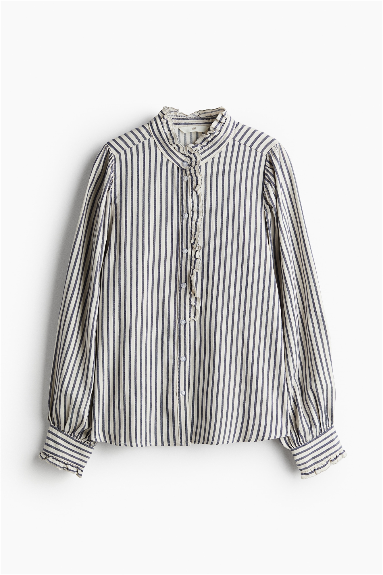 Блузка из мягкой хлопковой саржи с застежкой на пуговицы спереди и небольшим воротником-стойкой с отделкой воланом, продолжающимся вдоль застежки на пуговицы. Длинные рукава-баллоны с манжетами на пуговицах и воланом.