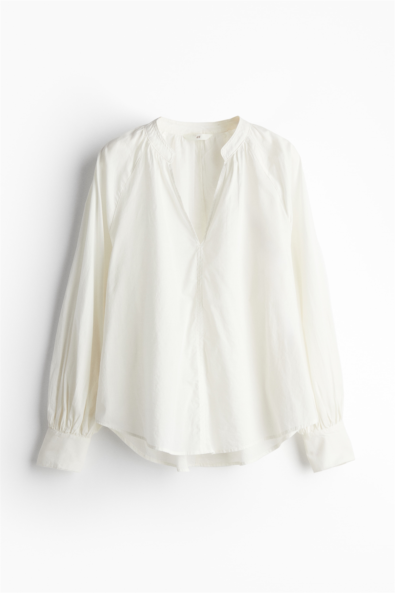 Свободная блузка из мягкого хлопкового полотна с воротником-бантом, V-образной проймой спереди и длинными рукавами реглан с манжетами на пуговицах. Закругленный подол, слегка удлиненный сзади.