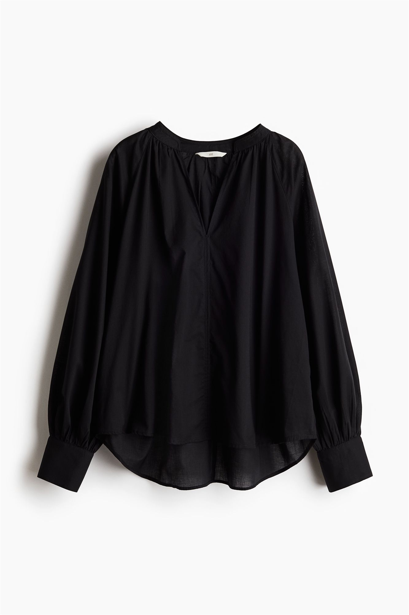Свободная блузка из мягкого хлопкового полотна с воротником-бантом, V-образной проймой спереди и длинными рукавами реглан с манжетами на пуговицах. Закругленный подол, слегка удлиненный сзади.