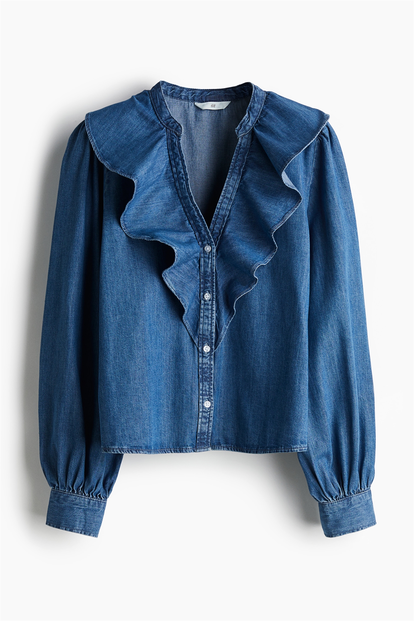 Блузка из мягкого хлопкового денима с открытым воротником-бантом, застежкой на пуговицы и воланом вокруг воротника, который продолжается вдоль застежки на пуговицы. Длинные рукава-баллоны с манжетами на пуговицах.