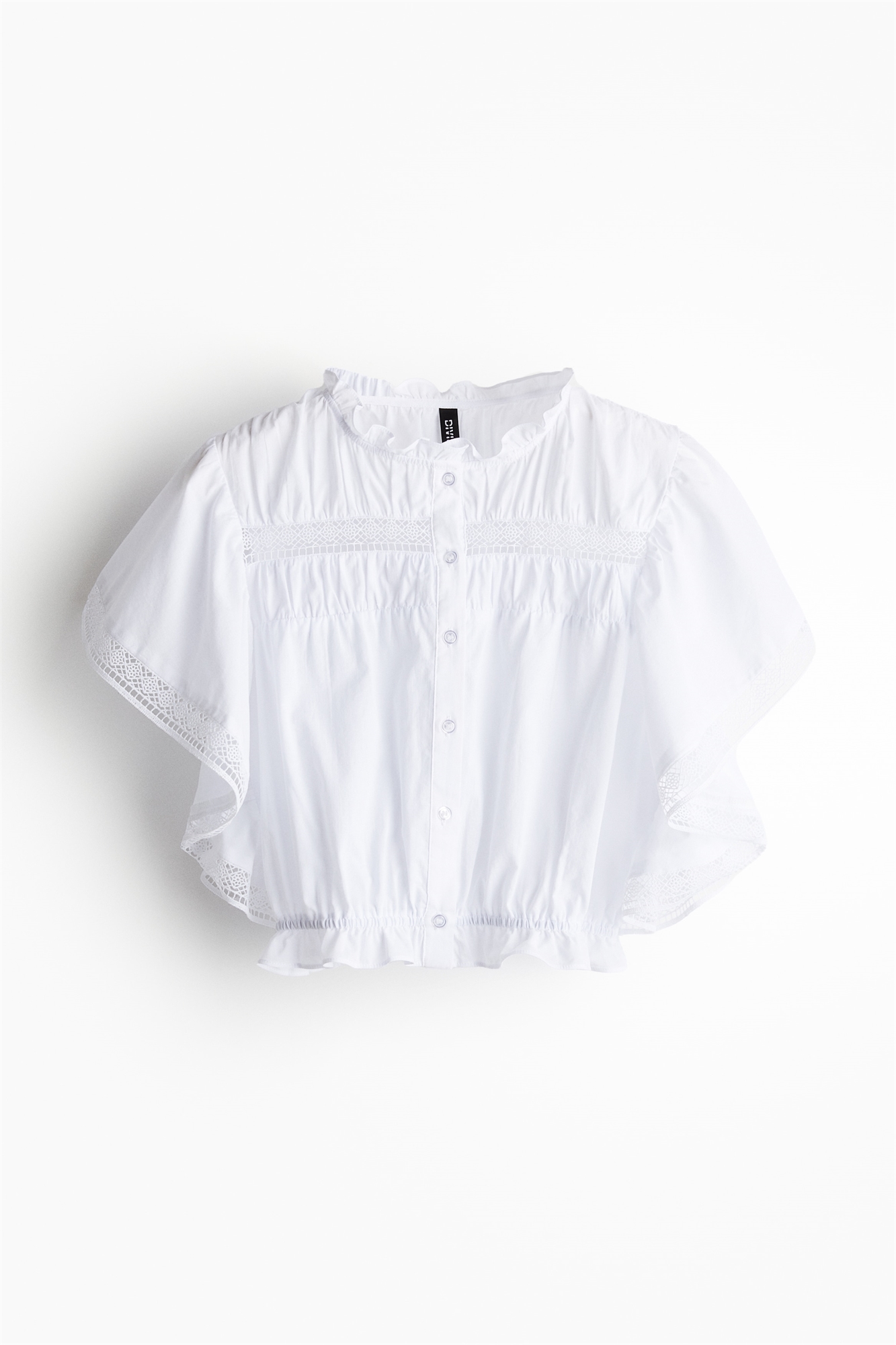 Короткая блузка из хлопкового полотна с воротником с оборками, пуговицами спереди, рукавами-бабочками и оборкой по подолу. Нежные кружевные вставки на груди и на манжетах.