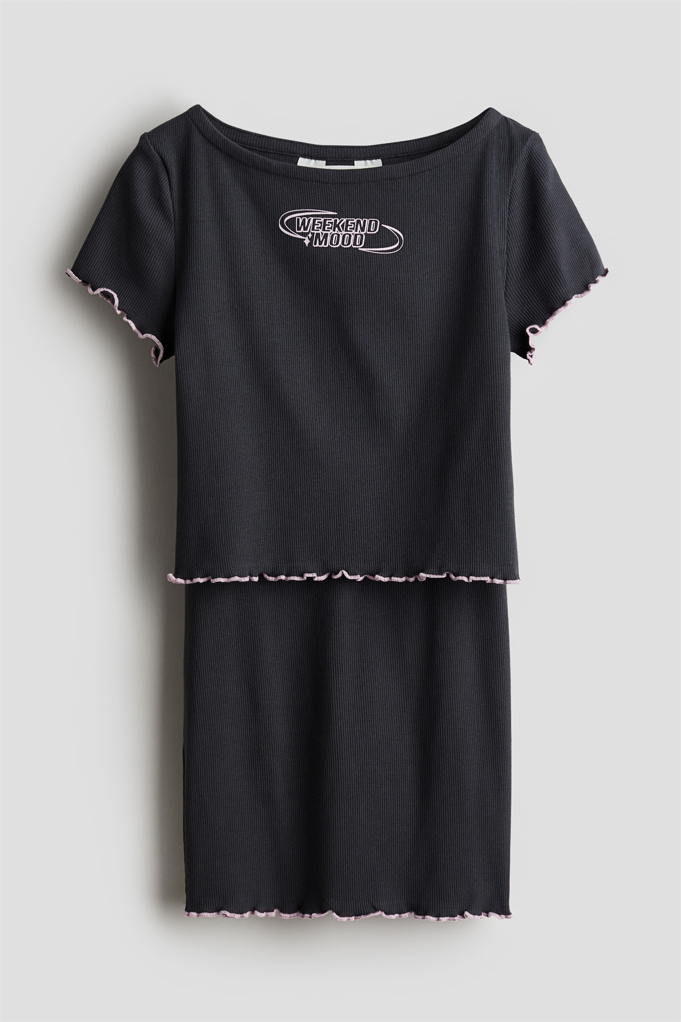 Комплект из футболки и юбки из мягкого, ребристого хлопкового джерси с оверлочными краями. Футболка с широким вырезом. Юбка с эластичной резинкой на талии.
