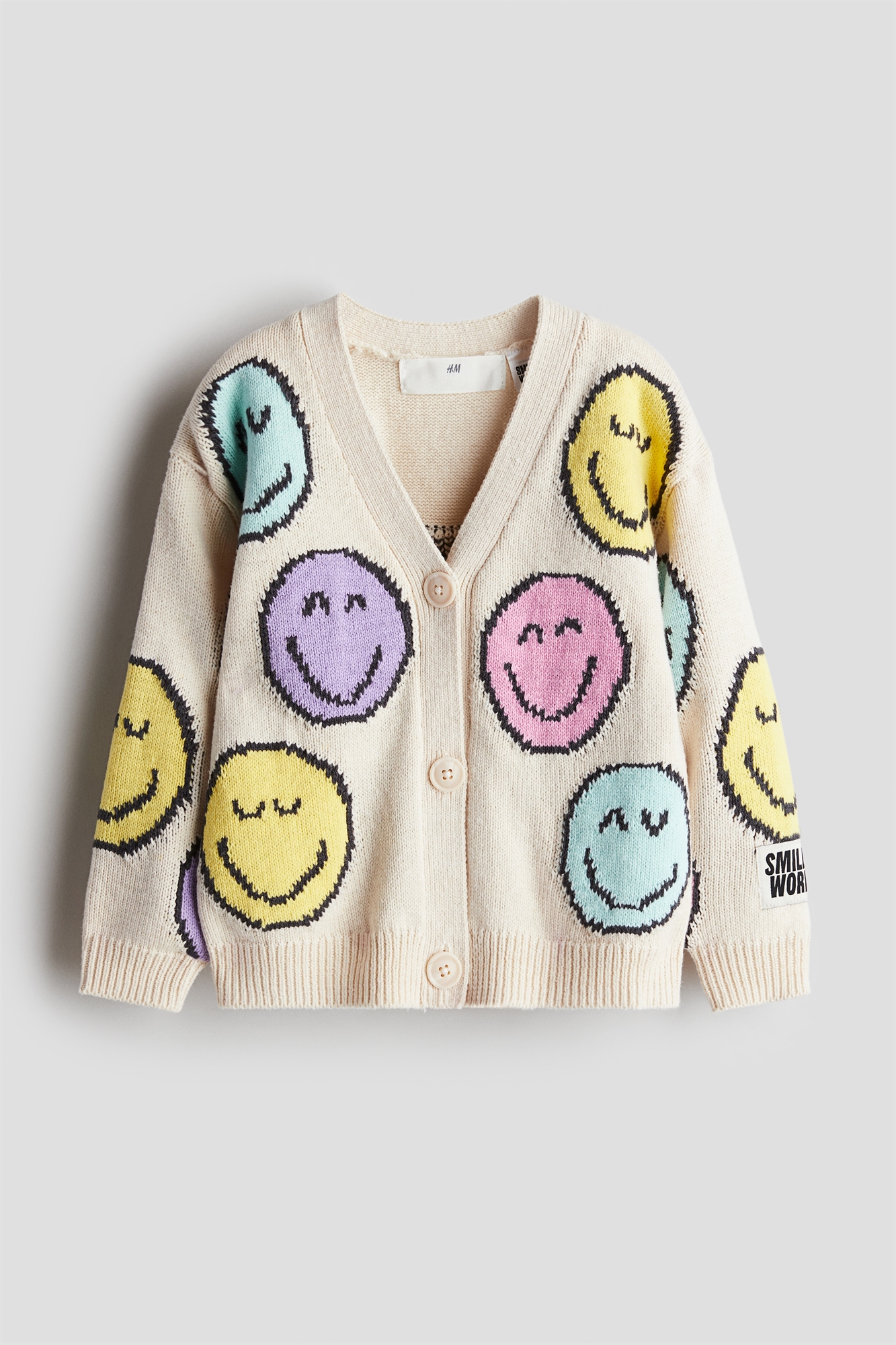 Кардиган из жаккардового трикотажа с узором по всей поверхности, V-образным вырезом горловины, пуговицами спереди и ребристой отделкой.