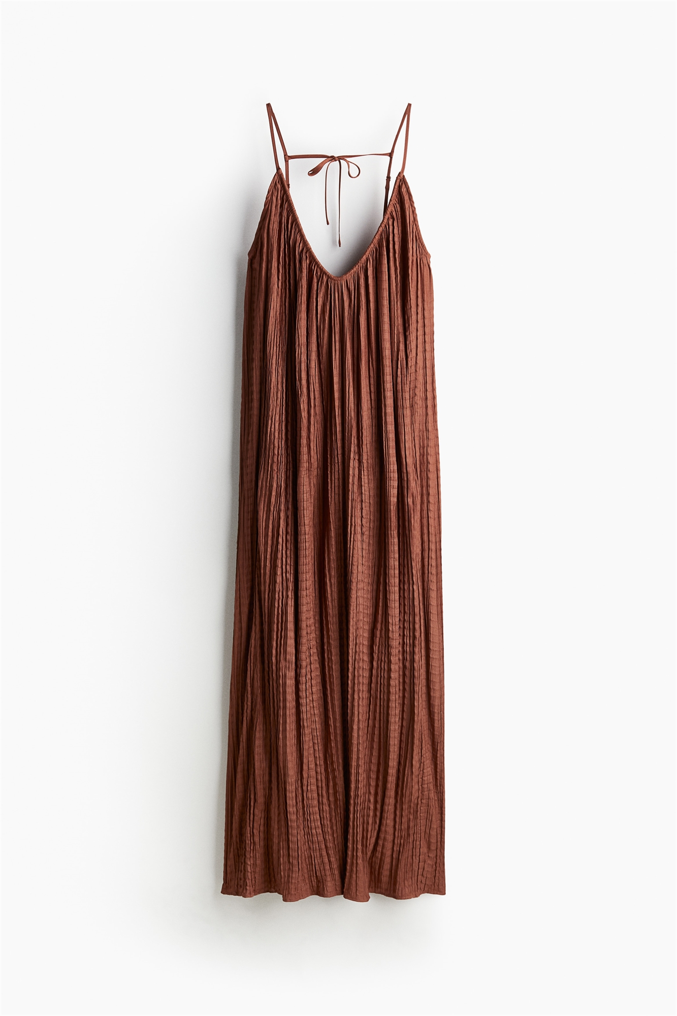 Плиссированное платье длиной до щиколоток из тканого материала с V-образным вырезом с потайной проволокой спереди и закрытой резинкой сзади. Регулируемые бретели-спагетти, соединенные горизонтальными завязками сзади. Без подкладки.