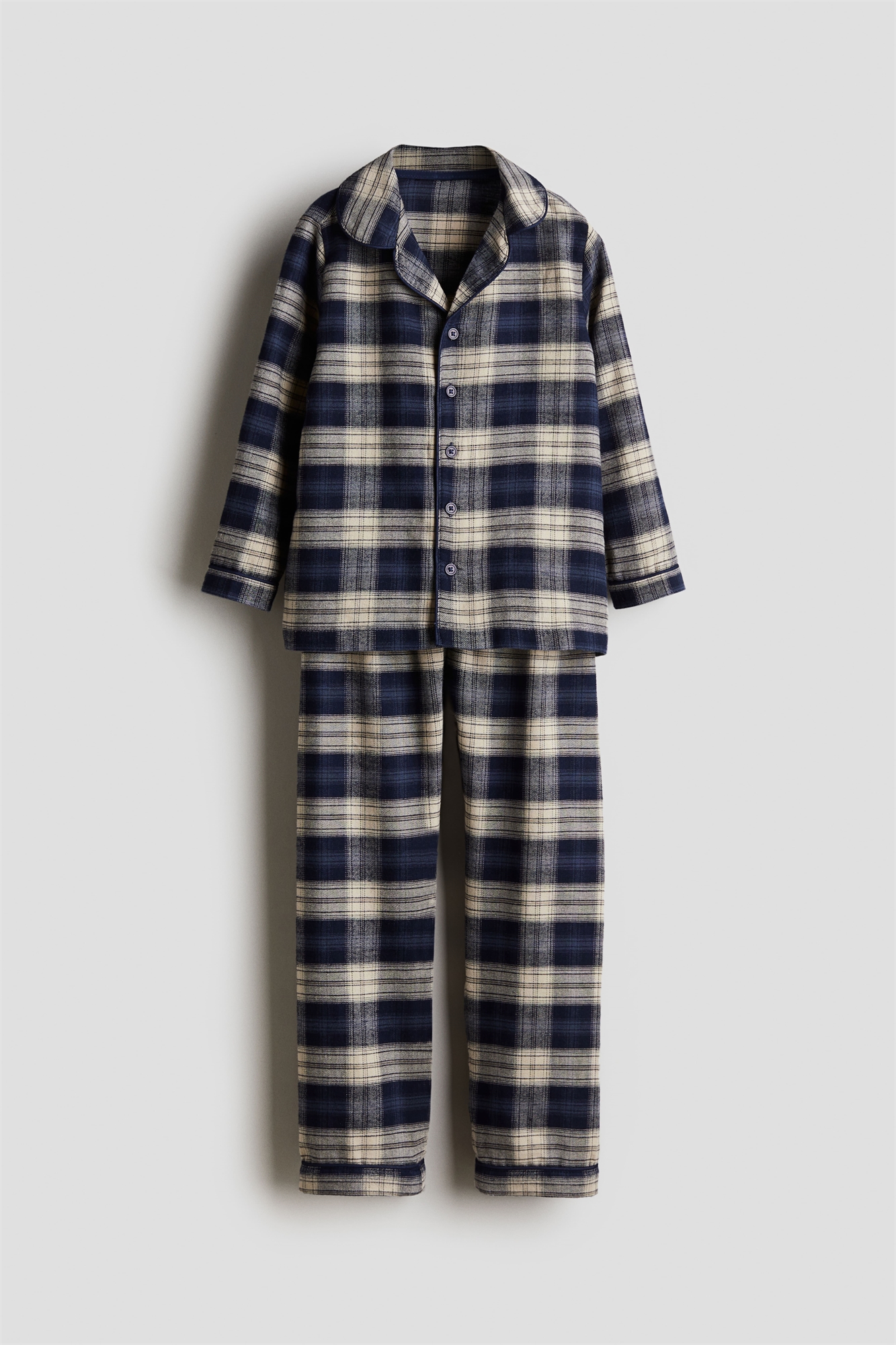 Пижама с рубашкой и низом из хлопковой фланели. Рубашка с отложным воротником, пуговицами спереди и отделкой манжет, воротника и проймы. Нижние штанишки с эластичной талией и отделкой по краям.