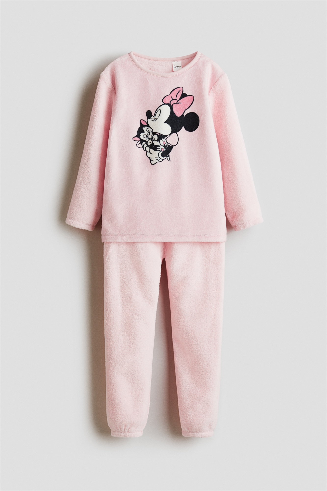 Пижама из мягкого велюра с принтом. Верхняя часть с круглым вырезом, длинными рукавами и эластичными манжетами. Низ с эластичным поясом и тесемками по краям.