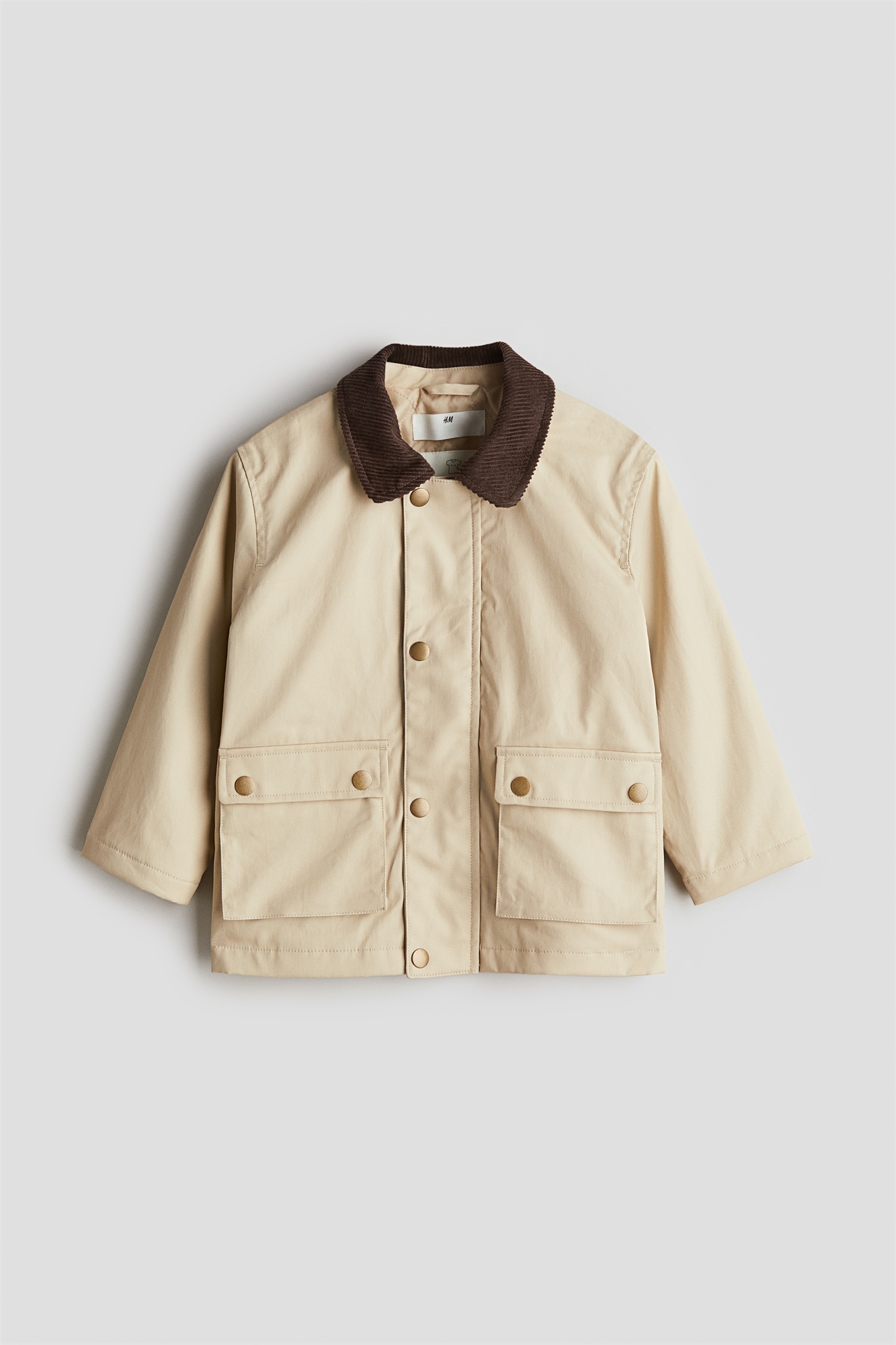 Куртка с легкой подкладкой из вощеной хлопковой саржи с вельветовым воротником. Свободный крой, застежка на молнию и ветрозащитная планка с прижимами спереди, длинные рукава с заплатками на локтях, прорезные передние карманы с клапаном и прижимами. Стеганая подкладка.
