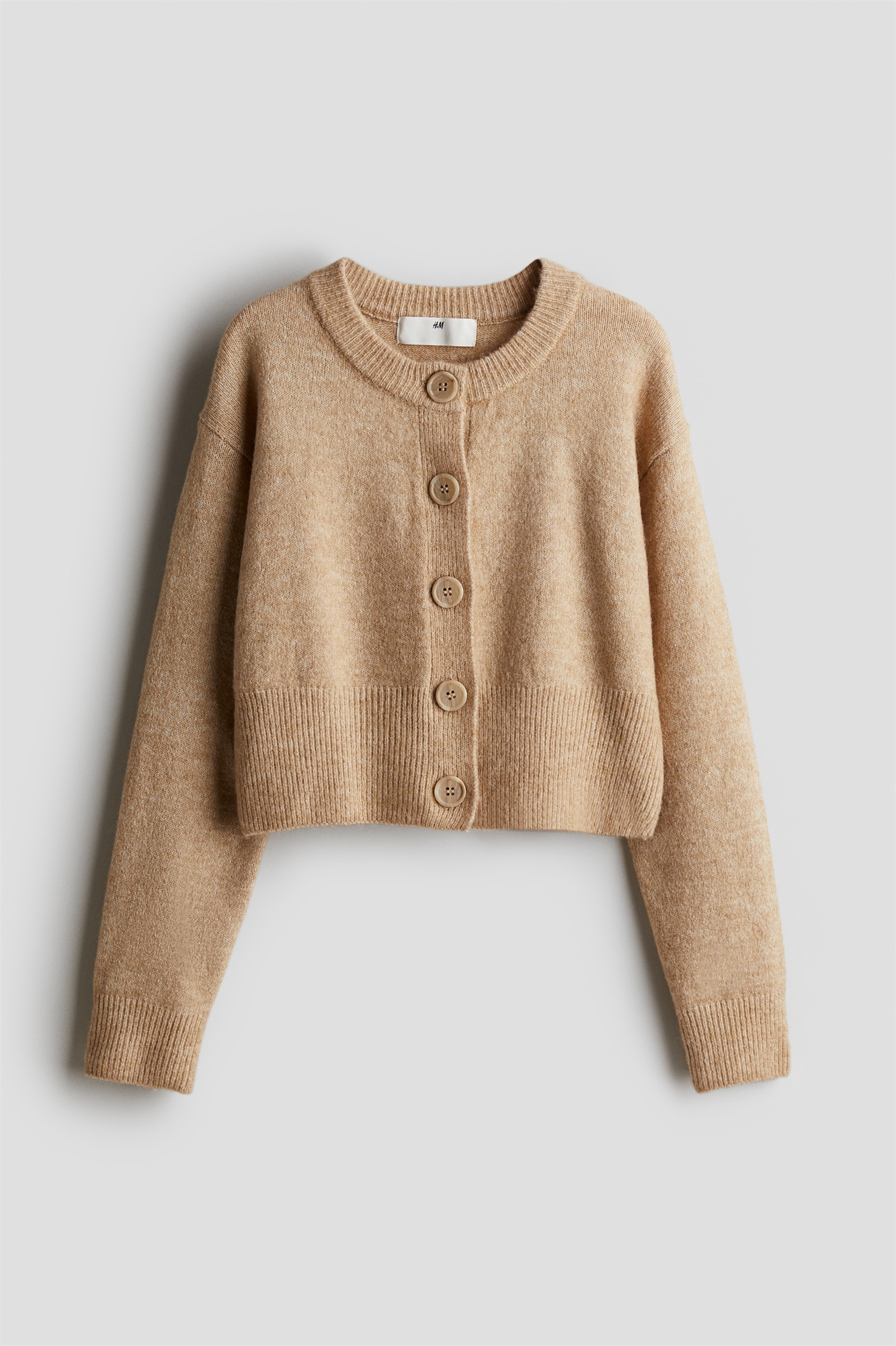 Кардиган из тонкого матового трикотажа с круглым ребристым вырезом и пуговицами спереди. Спущенные плечи и широкие манжеты и подол с ребристой отделкой.