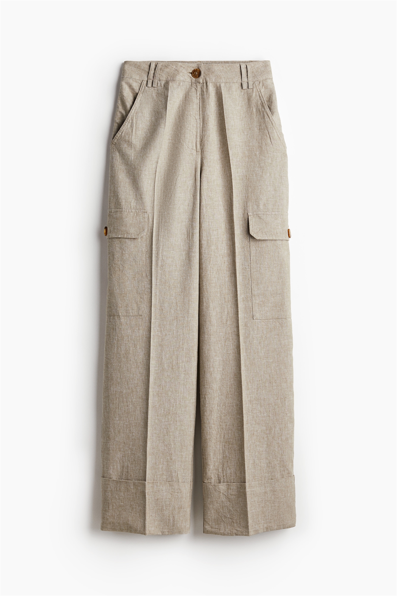 Брюки-карго из тканого материала из смеси хлопка и льна. Высокая талия, ширинка на молнии и пуговице, диагональные боковые карманы, фальшивые накладные карманы сзади и накладные карманы на ногах с пуговицей. Прямые ноги со складками спереди и сзади и вшитыми подворотами на подоле.