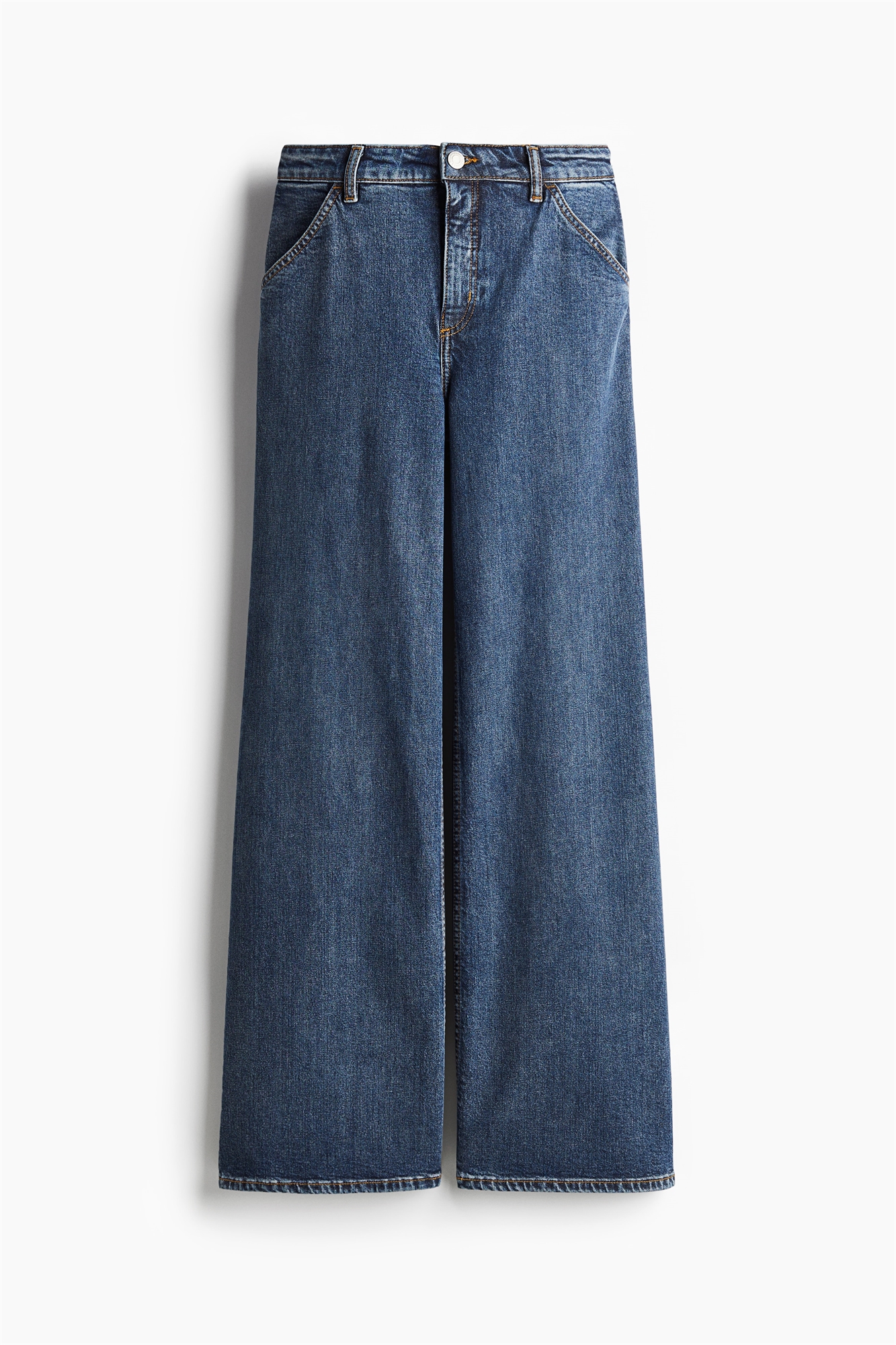 Джинсы из слегка тянущегося хлопкового денима с широкими штанинами. Высокая талия, ширинка на молнии и пуговице, диагональные боковые карманы и фальшивые карманы сзади.