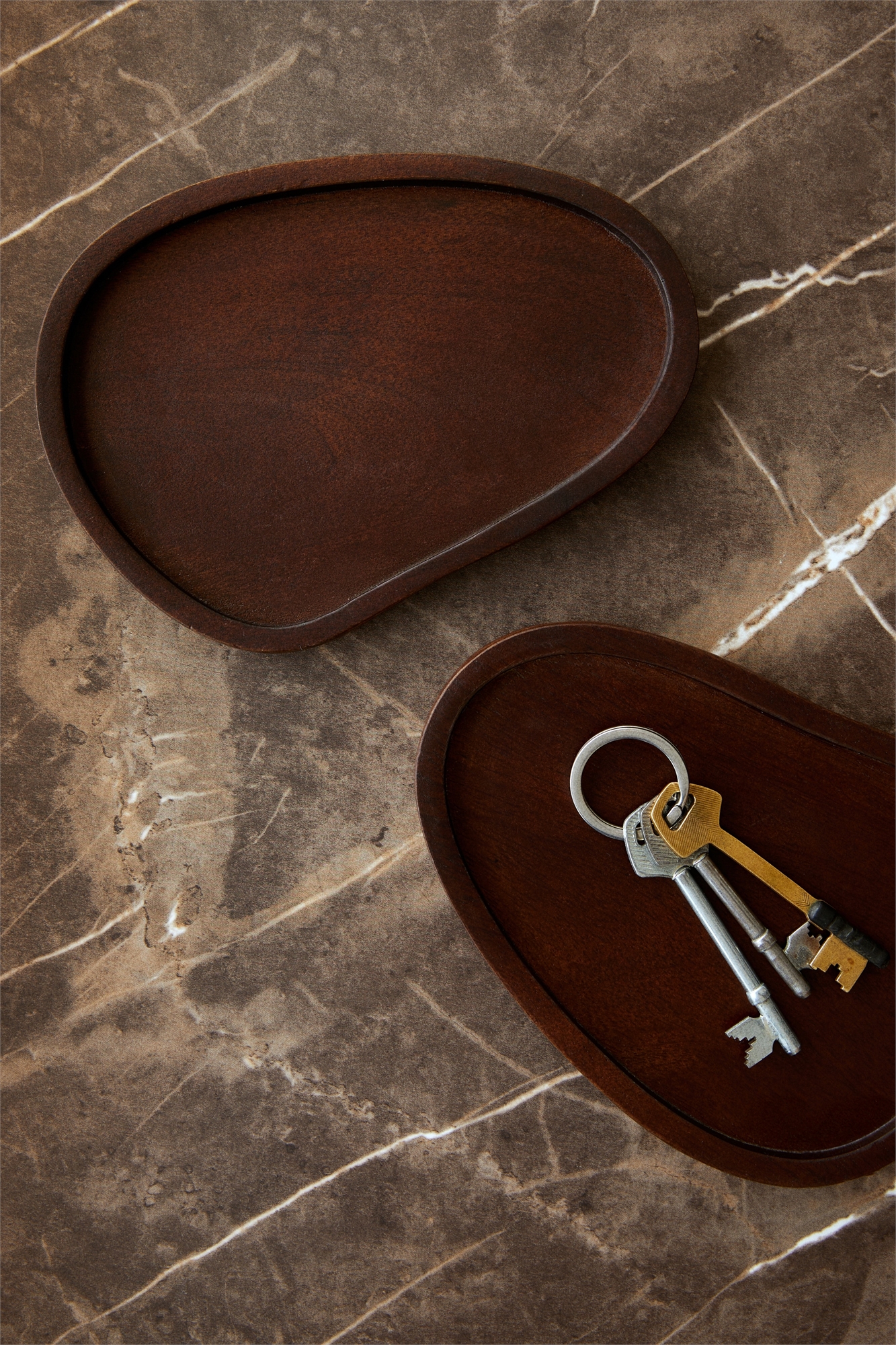 Небольшой поднос из дерева манго овальной, слегка неправильной формы. Ширина в самом широком месте 13 см. Длина 18 см.