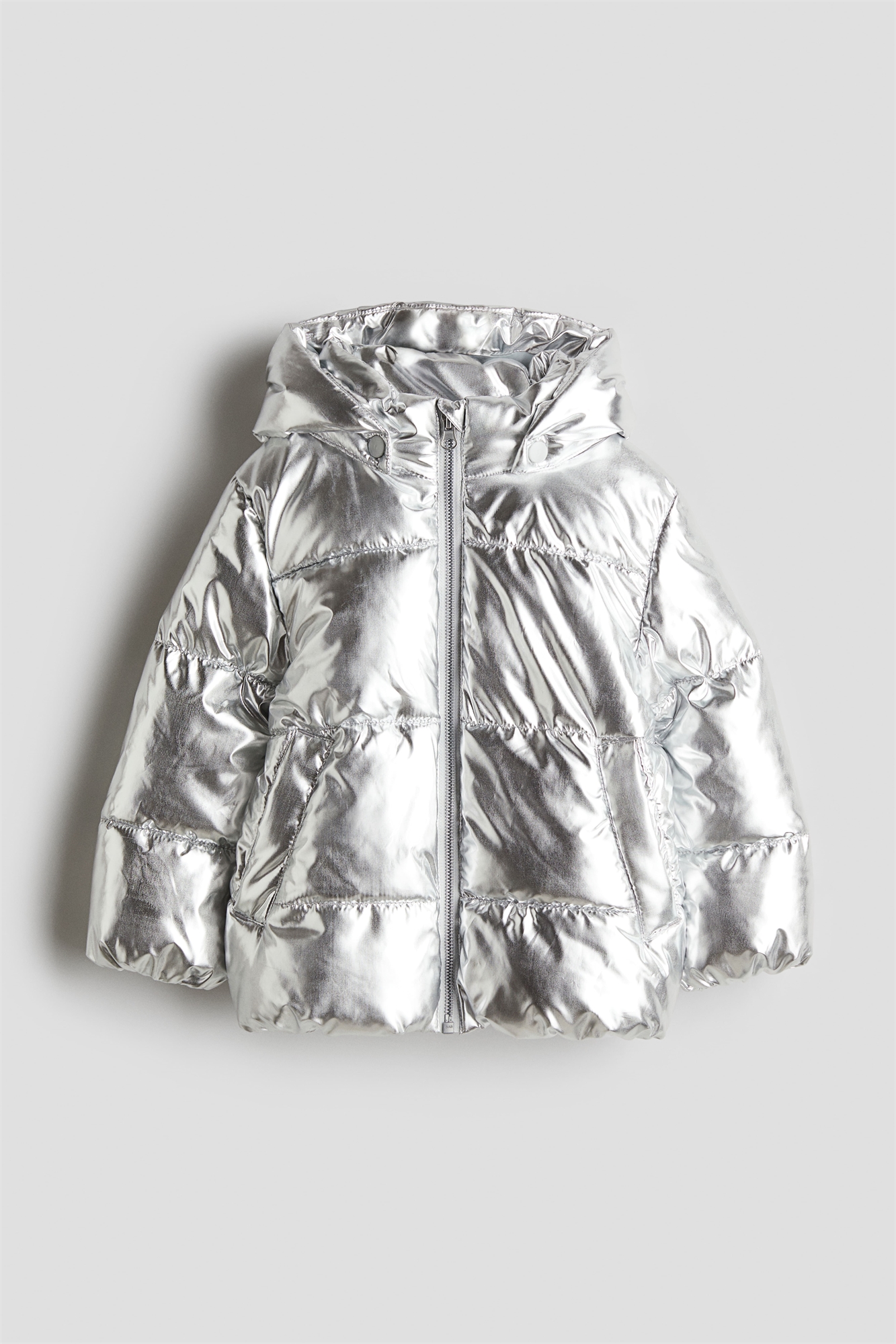 Стеганая куртка-пуховик из переливающейся ткани со съемным капюшоном. Воротник-стойка, застежка-молния спереди и прорезные карманы спереди. Эластичные манжеты и подол. На подкладке.