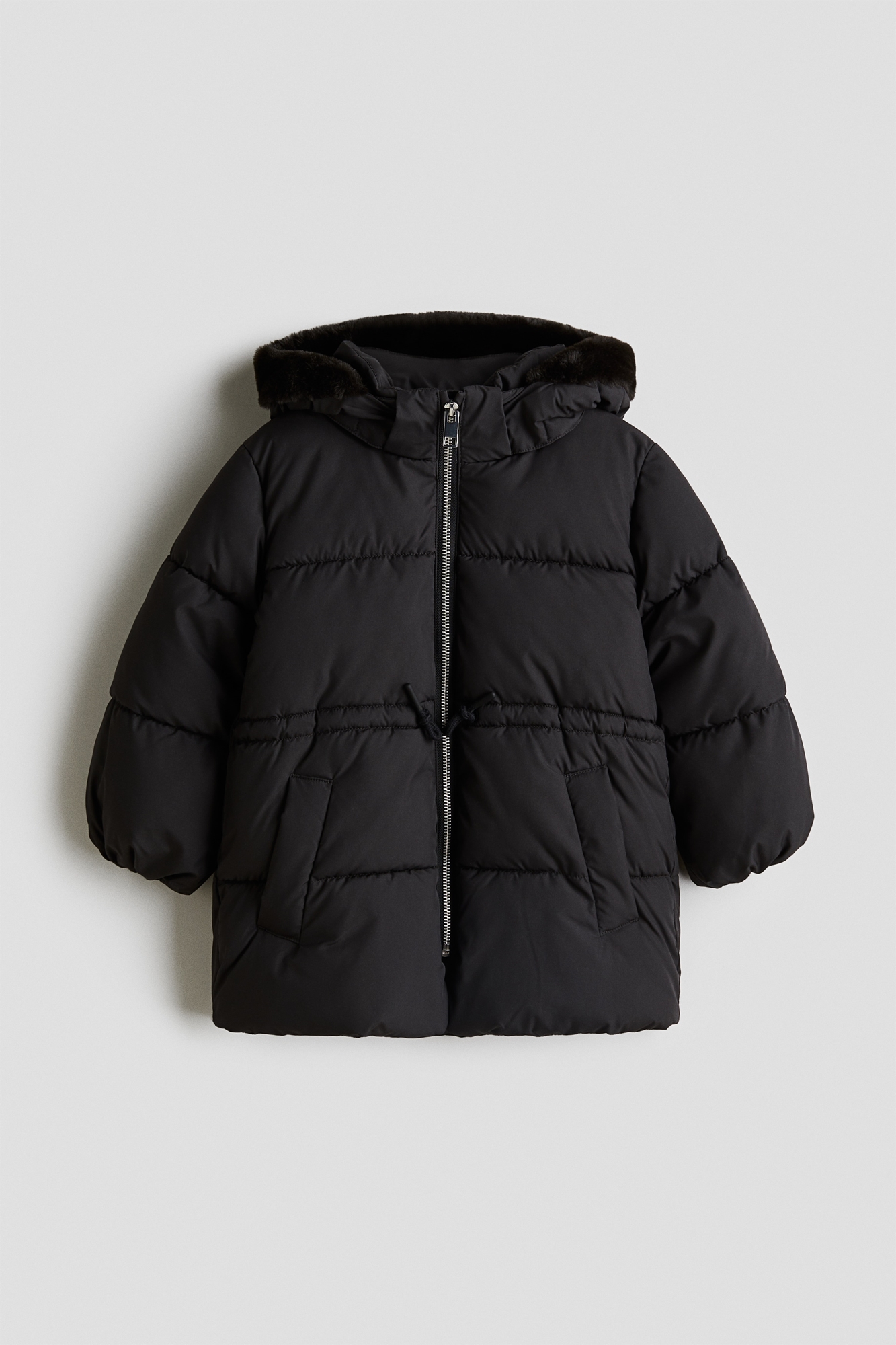Пуховая куртка с мягкой подкладкой и съемным капюшоном с ворсовой подкладкой. Воротник-стойка, застежка-молния спереди и эластичные манжеты со складками. Затягивающаяся талия и передние карманы. На подкладке.