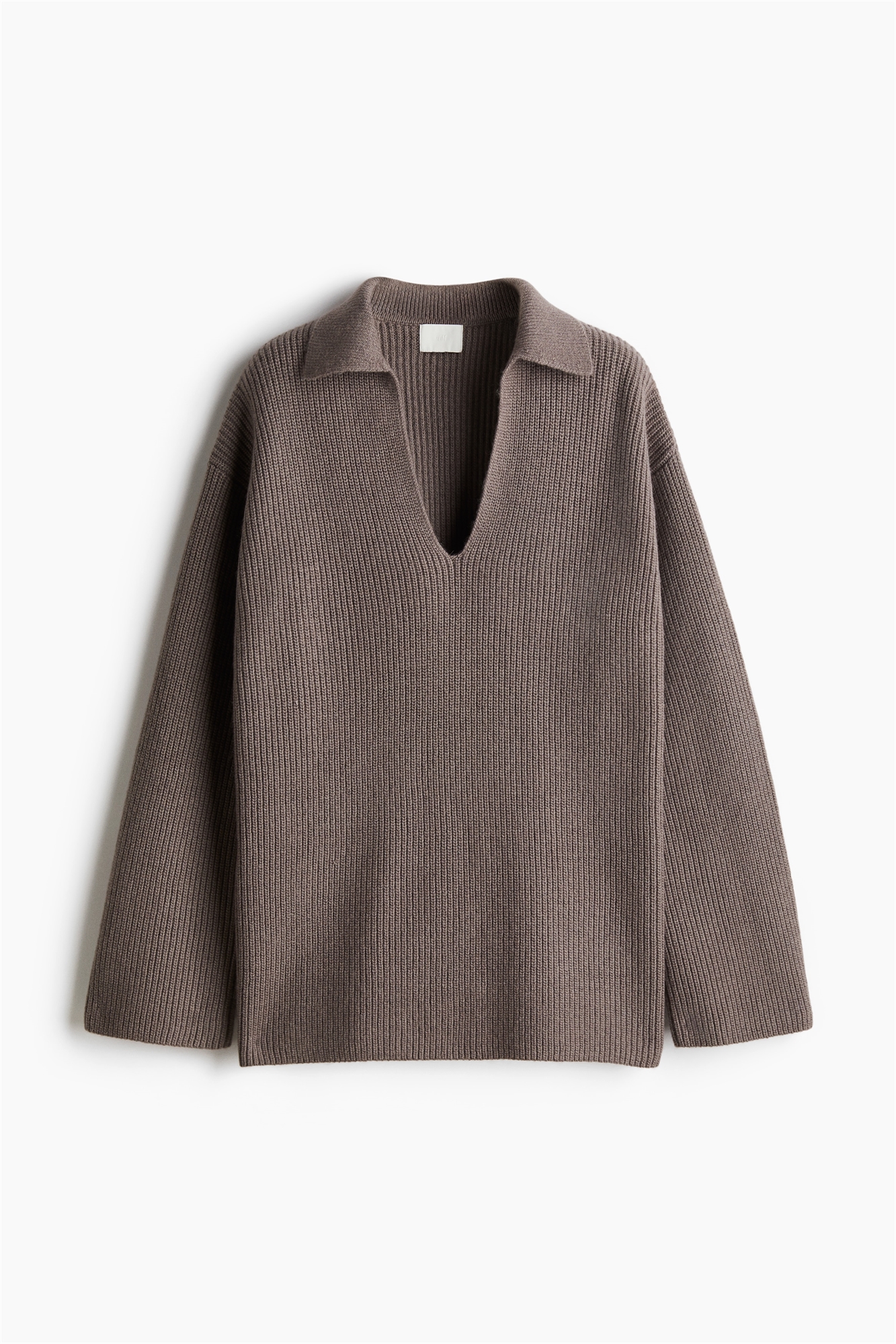 Джемпер свободного покроя из трикотажа в рубчик с воротником, V-образной проймой спереди, низко опущенными плечами и длинными рукавами.