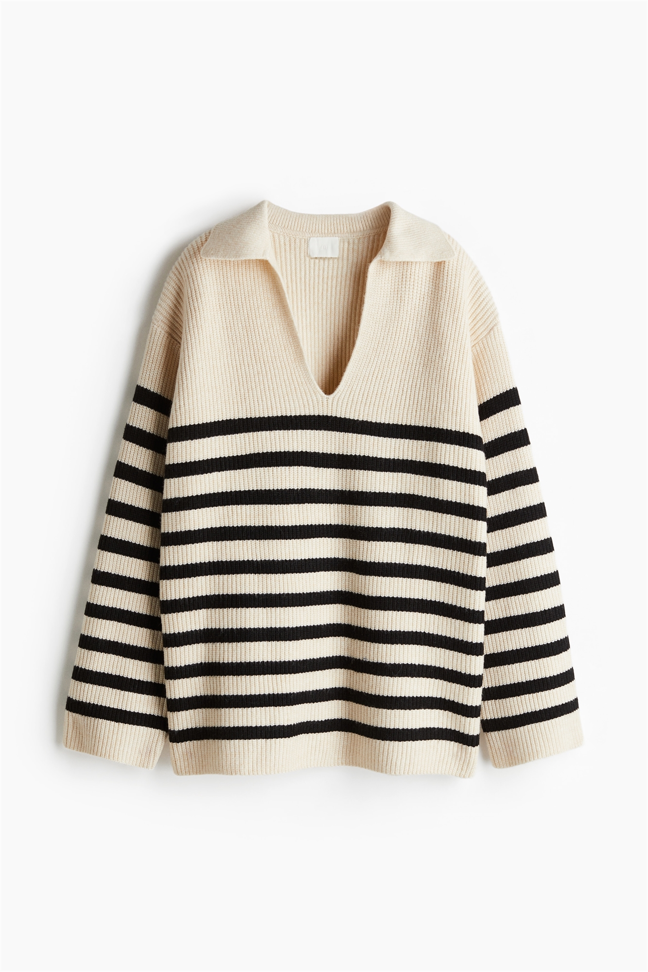 Джемпер свободного покроя из трикотажа в рубчик с воротником, V-образной проймой спереди, низко опущенными плечами и длинными рукавами.