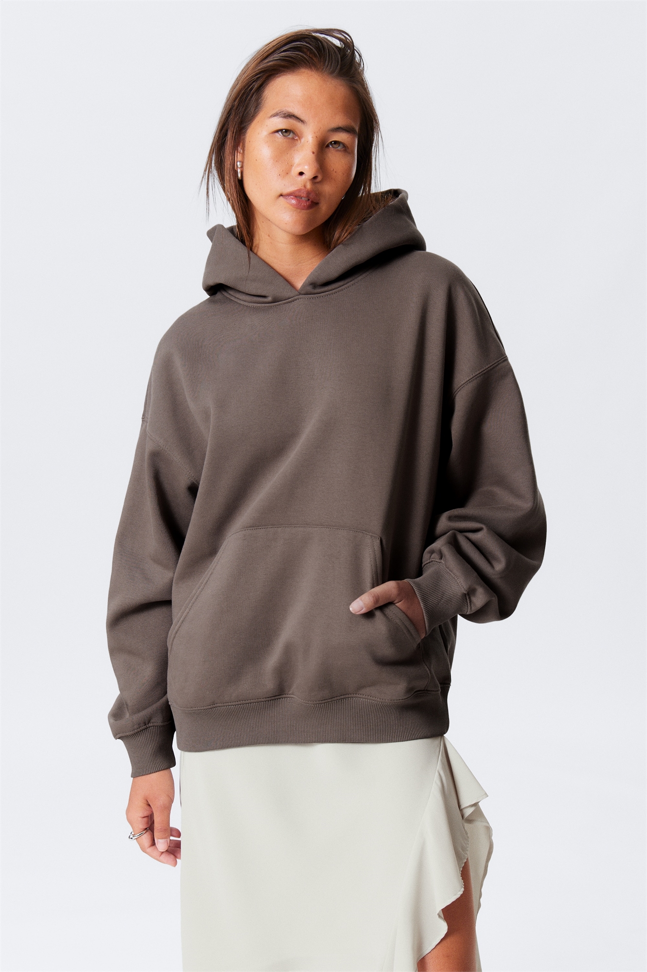 Худи оверсайз из мягкой, плотной смеси хлопка и переработанного полиэфирного флисового трикотажа. Модель имеет сутулый силуэт с опущенными плечами, карман-кенгуру, большой вместительный капюшон без утяжки и ребристые края.