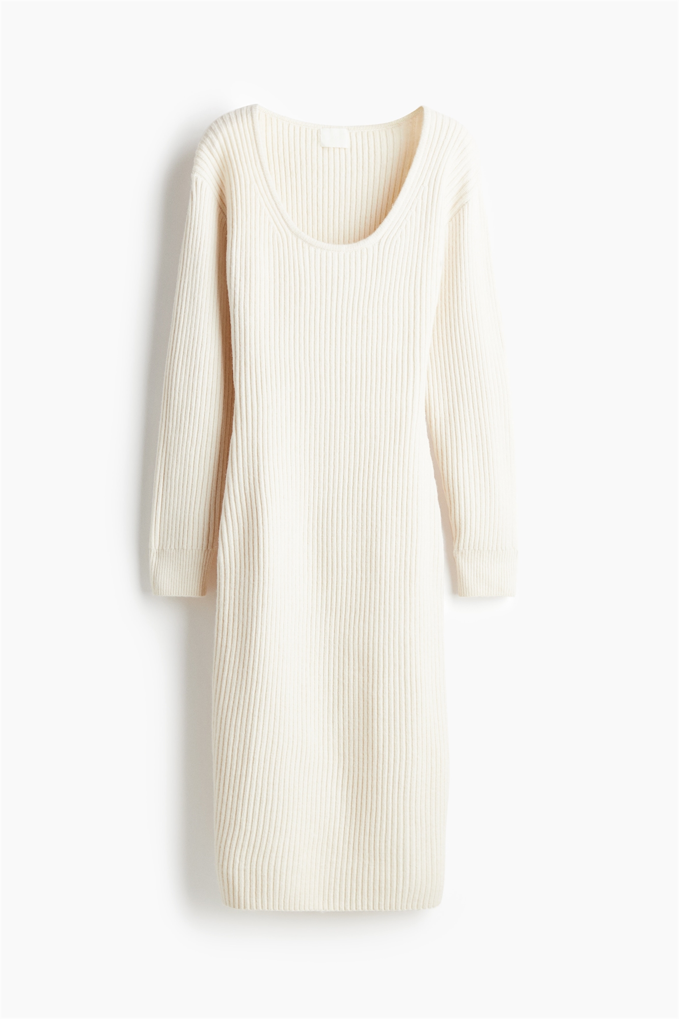 Приталенное платье длиной до колен из мягкого трикотажа в рубчик с вырезом "совок", слегка спущенными плечами и длинными рукавами с манжетами.