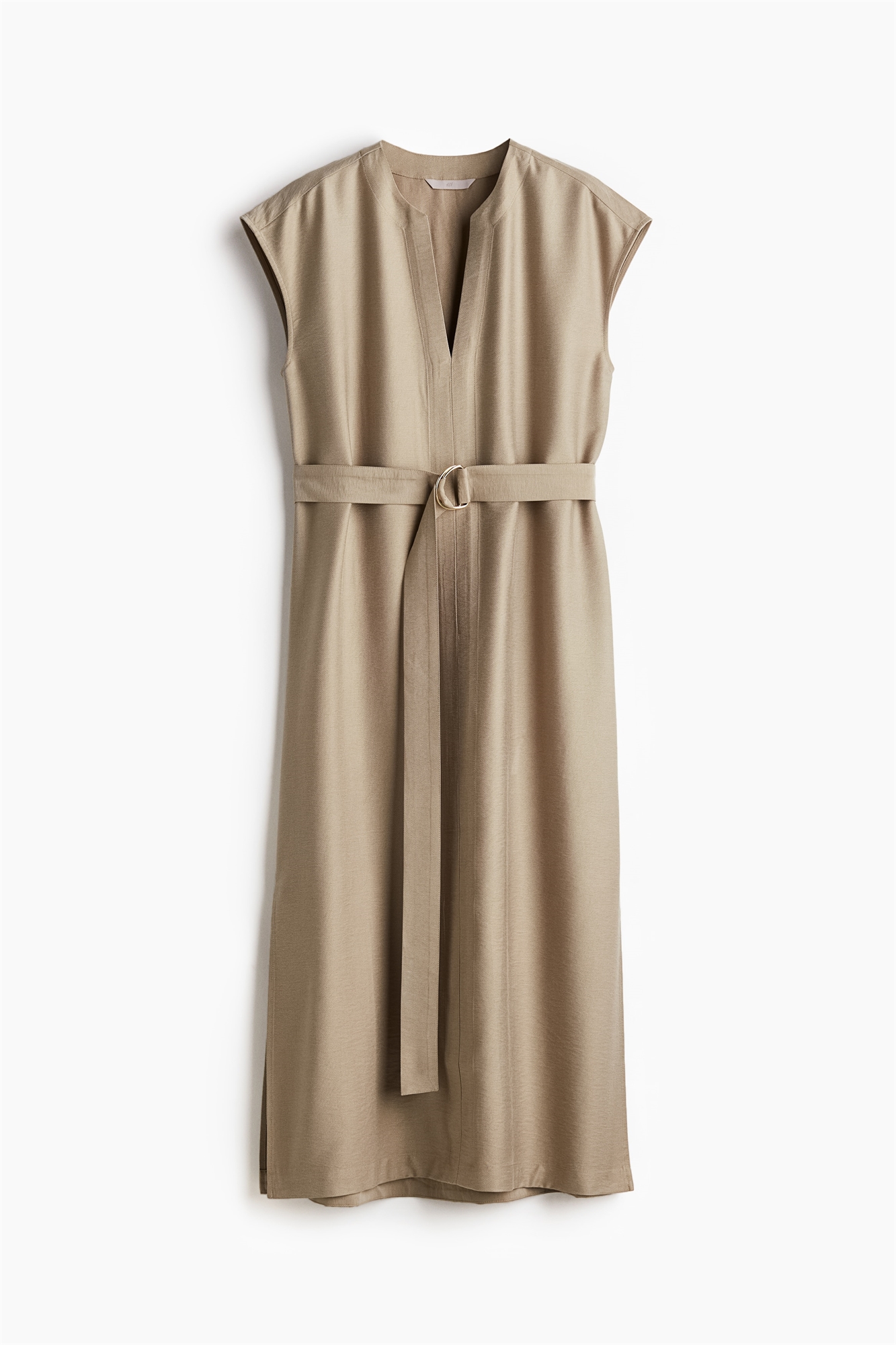 Платье длиной до колен, без рукавов, из тканого материала, с круглым вырезом и V-образной проймой спереди. Съемный пояс на талии с металлическими D-кольцами и подол прямого кроя с разрезом с каждой стороны. Без подкладки.