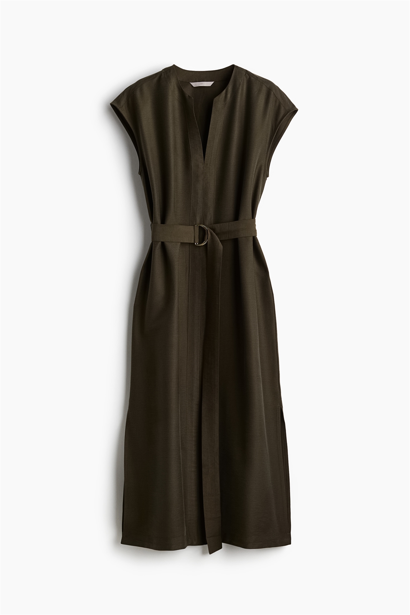 Платье длиной до колен, без рукавов, из тканого материала, с круглым вырезом и V-образной проймой спереди. Съемный пояс на талии с металлическими D-кольцами и подол прямого кроя с разрезом с каждой стороны. Без подкладки.