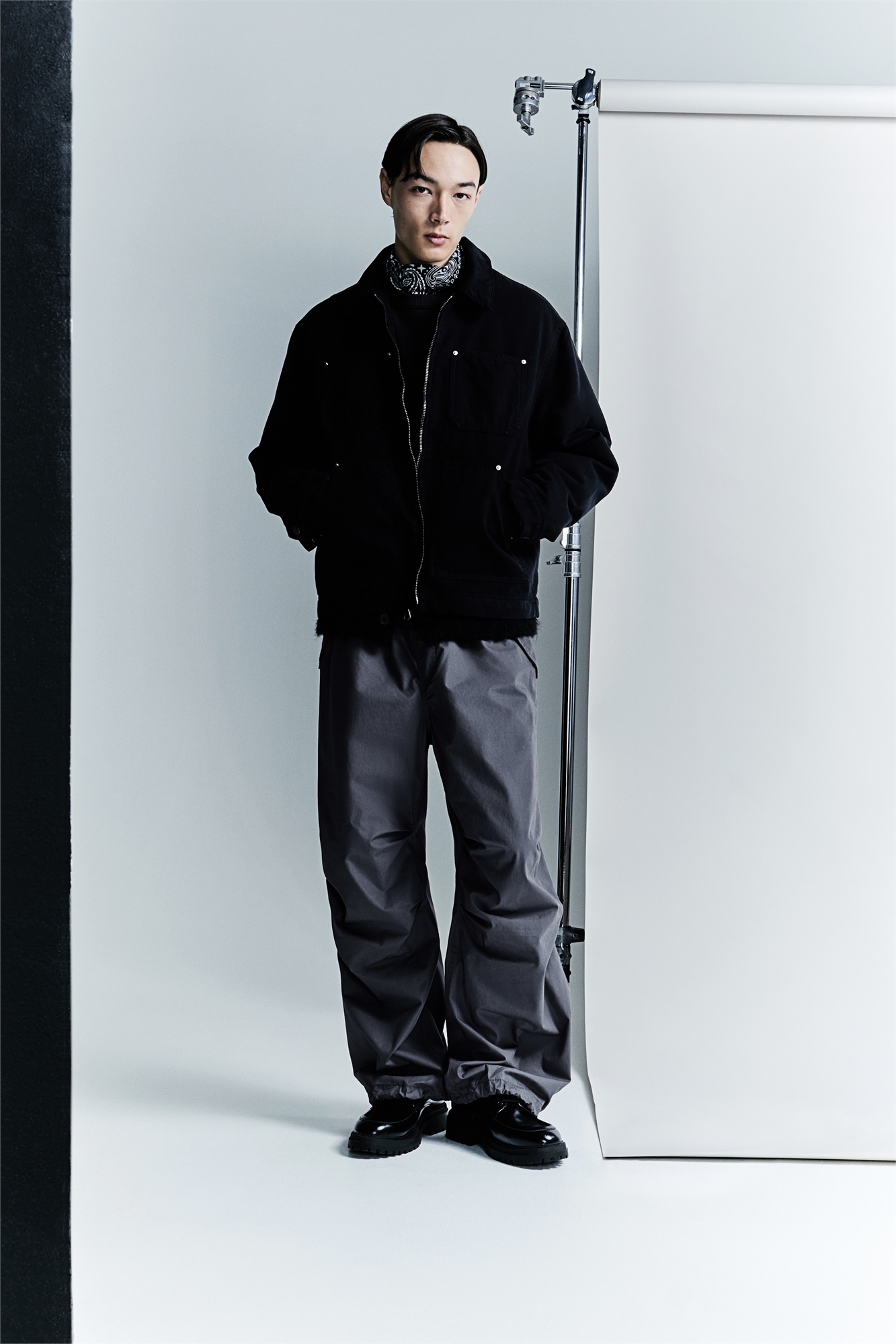 Брюки-парашюты из хлопкового полотна с фальшивой ширинкой и утягивающим шнурком с ограничителями и эластичным материалом на талии. Накладные карманы с застежкой на кнопки по бокам и сзади. Складки по бокам коленей для придания дополнительной ширины. Скрытый шнурок по краям. Свободный крой для создания объемного, но не чрезмерно большого силуэта.