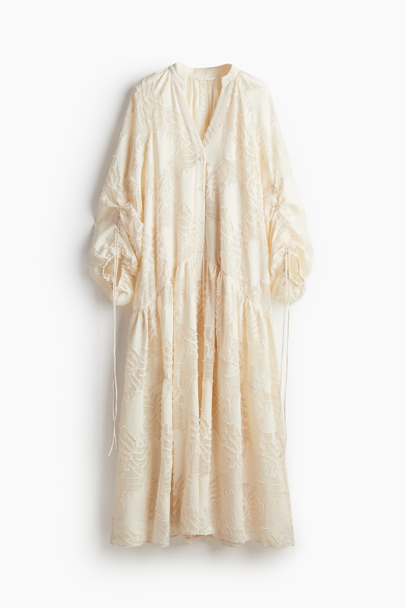 Длинное платье из жаккардового переплетения с воротником-бантом, V-образной проймой и застежкой на пуговицы спереди. Длинные рукава-баллон реглан с завязками и эластичными манжетами. Изогнутый шов со складками ниже бедер для придания дополнительного объема. Нижнее платье из джерси с V-образным вырезом и регулируемыми бретелями.