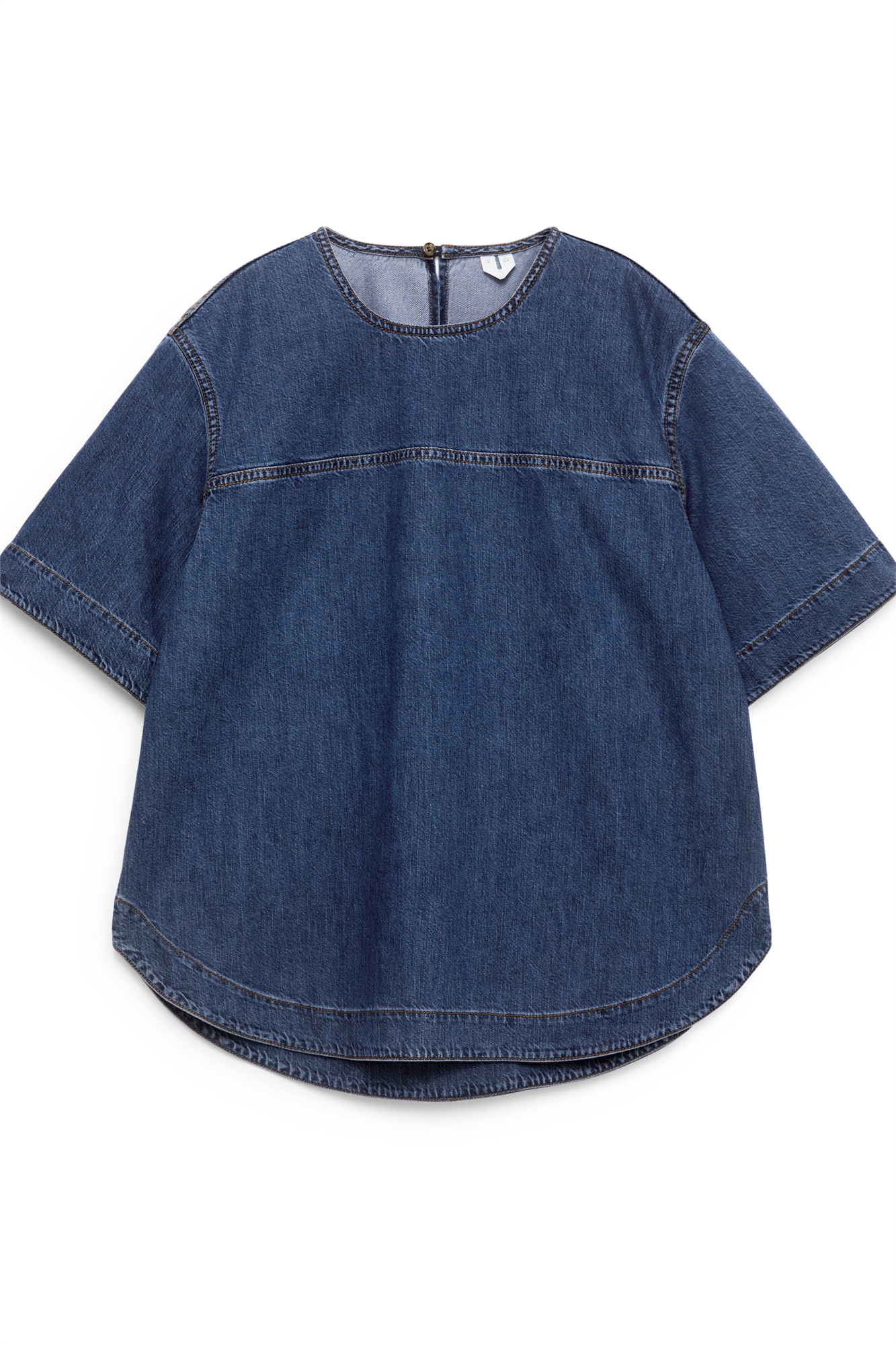 Джинсовый топ с короткими рукавами, круглым вырезом и закругленной линией подола. Модель в стиле поп-овер с отверстием для ключа и одной пуговицей сзади. Спереди и сзади - шов "иго". Обычный крой.