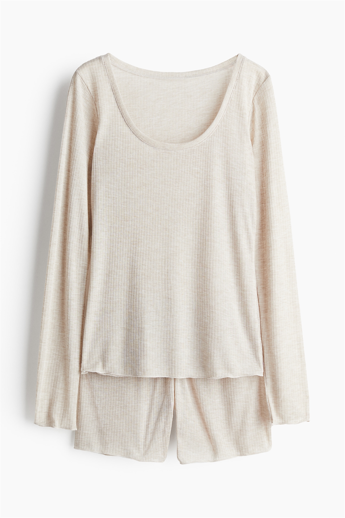 Пижама с рубашкой и шортами из воздушного ребристого трикотажа. Облегающая фигуру футболка с длинными рукавами, глубоким круглым вырезом и оверлочными кантами на рукавах и подоле. Шорты с эластичным поясом и оверлоком по подолу.