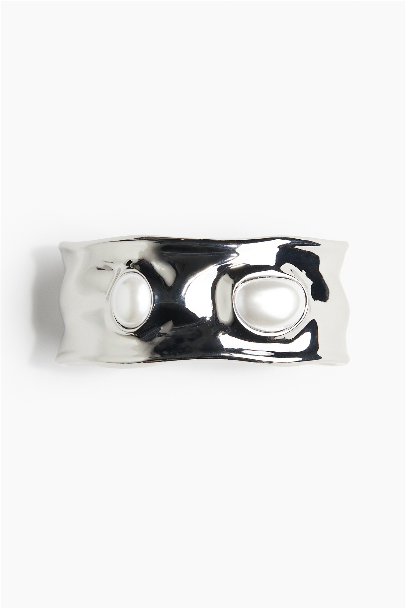 Металлический браслет-манжета с неровной поверхностью, украшенный перламутровыми пластиковыми бусинами.
