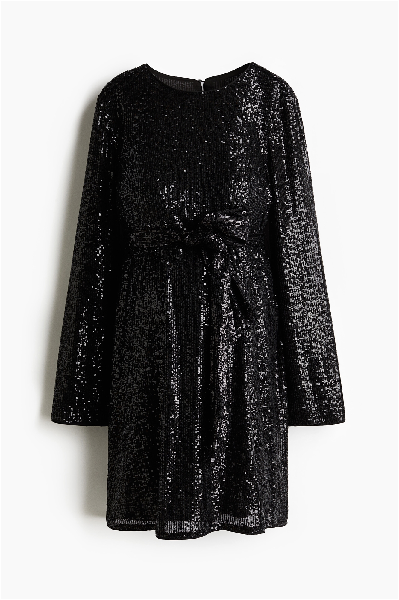 Короткое платье из блестящей сетки с круглым вырезом и отверстием под ключ с потайной пуговицей сзади. Длинные широкие рукава, нагрудные вытачки и съемный пояс-завязка под бюстом. На подкладке.