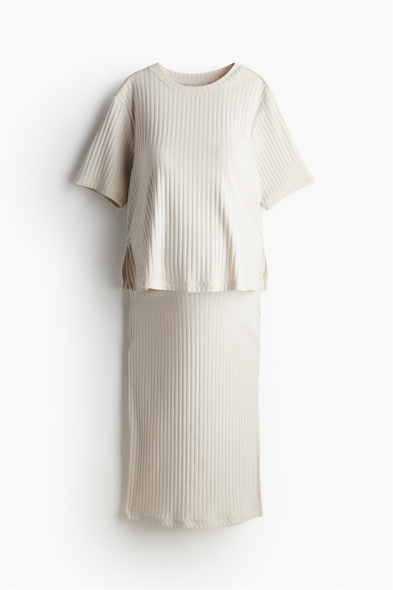 Комплект из топа и юбки из мягкого, ребристого хлопкового джерси. Топ с круглым вырезом, короткими рукавами и разрезом на подоле с одной стороны. Приталенная юбка длиной до колена с эластичной отделкой в верхней части и прямым подолом с разрезом с одной стороны.