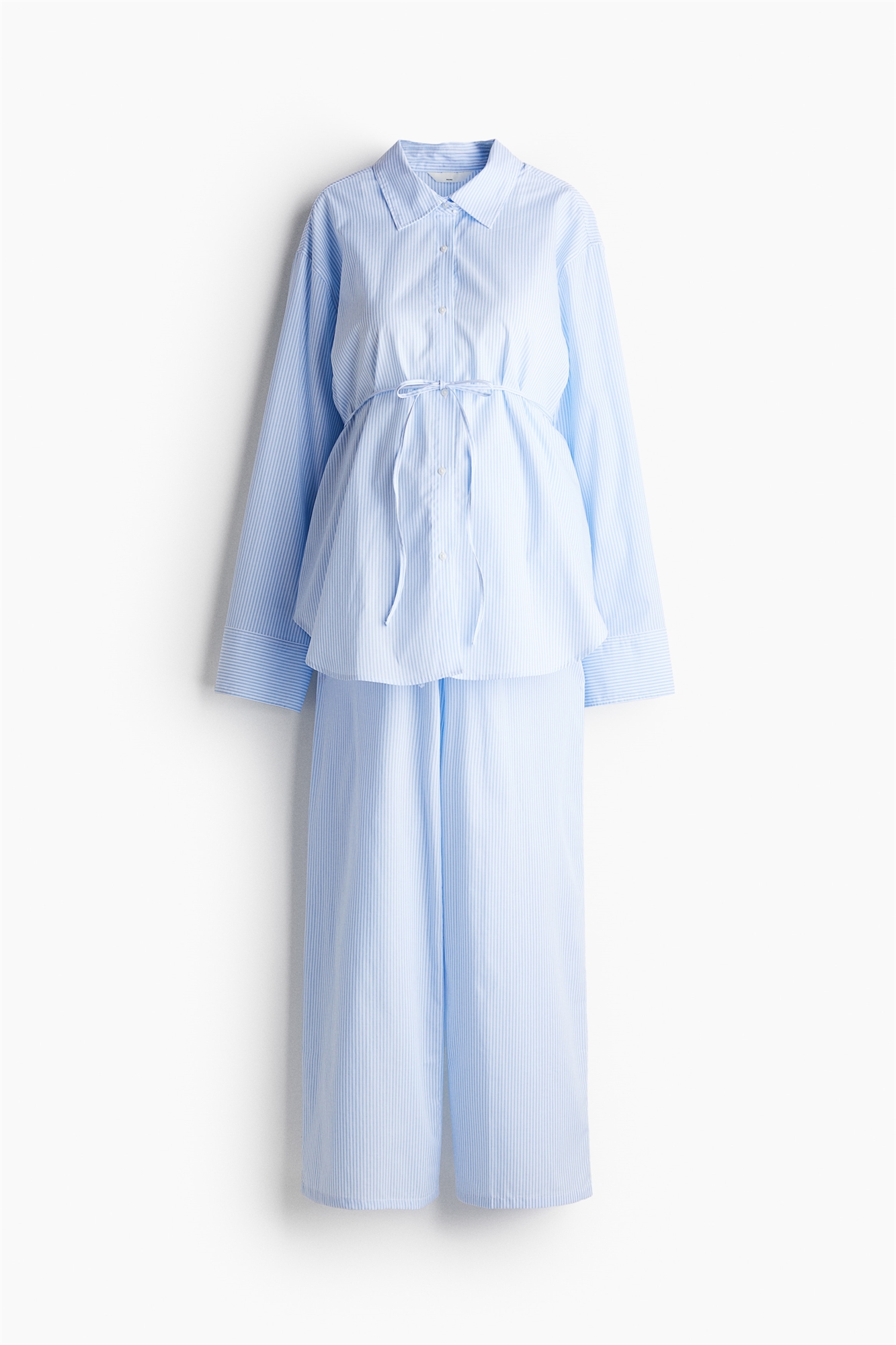 Пижама с рубашкой с длинными рукавами и нижним бельем из хрустящего хлопкового поплина. Рубашка с воротником, застегивается на пуговицы спереди, имеет узкий пояс под бюстом, слегка спущенные плечи и манжеты на пуговицах. Нижние брюки с заниженной эластичной талией на шнурке для удобной посадки во время и после беременности.