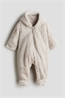 Костюм для коляски из мягкой пушистой ткани с капюшоном, украшенным ушками. Застежка-молния спереди, продолжающаяся по одной ноге, и защита подбородка. Отложные манжеты и полные ножки для сохранения тепла. Подкладка из мягкого трикотажа.