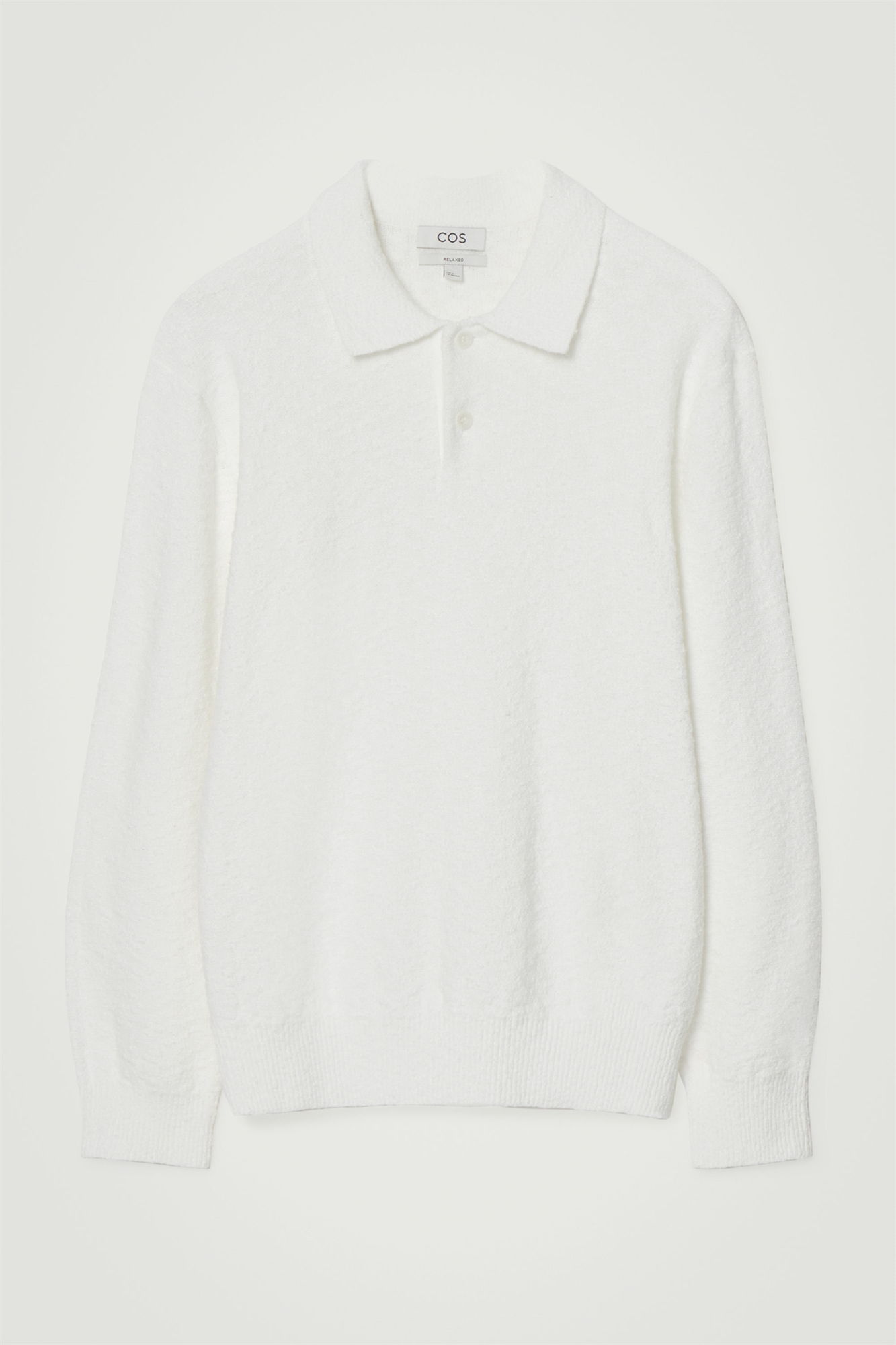Эта рубашка-поло с длинными рукавами выполнена из тактильного хлопкового трикотажа букле, который добавит фактурный акцент в ваш гардероб. Она выполнена в нестареющем белом цвете и имеет ребристый воротник, свободный силуэт и спущенные плечи. Свободный крой Застежка на пуговицы Переработанный хлопок состоит из волокон, полученных из до- и послепотребительских материалов, которые перерабатываются в новую пряжу Внешний материал: 51% хлопка, 28% переработанного хлопка, 21% переработанного полиамида. Детали исключены/Машинная стирка Длина по спинке в размере M = 64,5 см/Модель носит размер M
